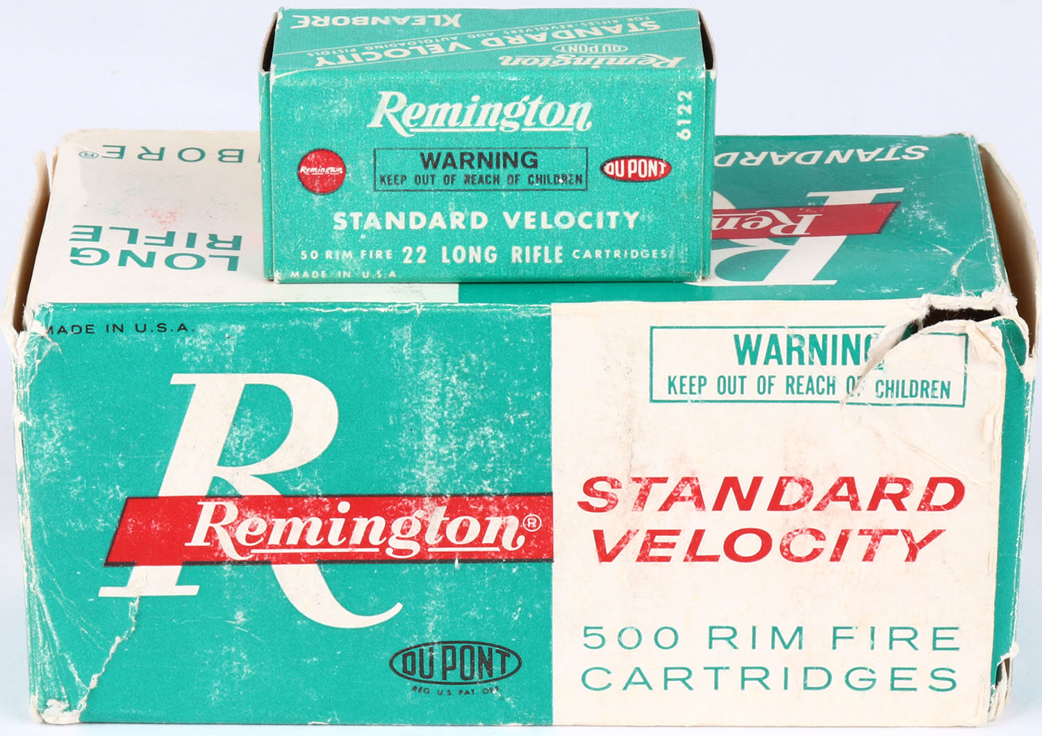 Remington, Standard Velocity, .22 Long Rifle, Full, 500rds. 1pc. Green white & red brick, brick is solid with very good color, shelf wear, edge & corner wear, several small tears on top, end flaps are solid, inside boxes are excellent. Grade: Very Good ++ - Value: 50 to 100