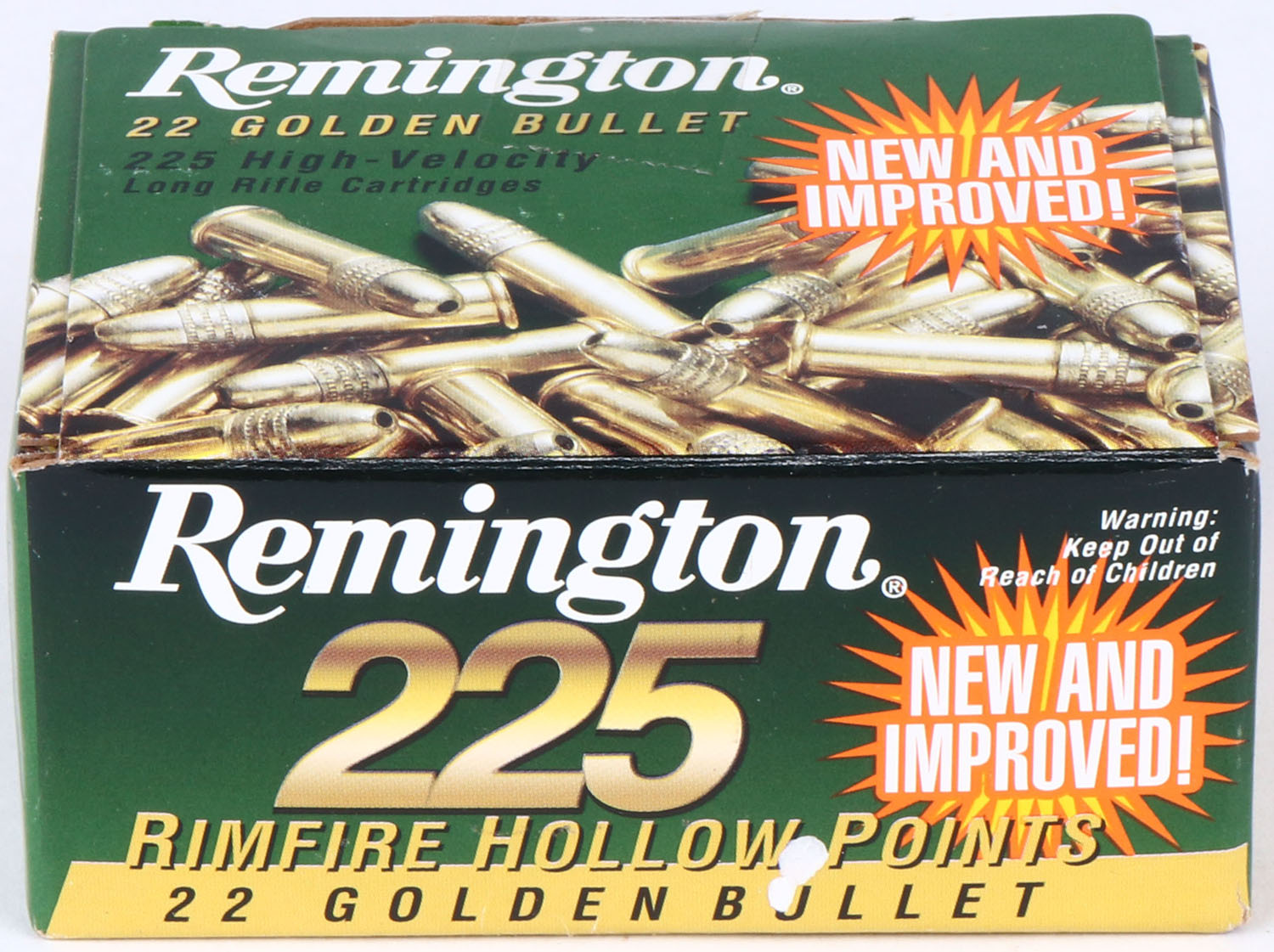 Remington, 22 Golden Bullet, .22 Long Rifle Hollow Point, High-Velocity, New and Improved, FULL & SEALED, 225rds. 1pc. Green white & yellow bulk box, box is MINT with minty color, corners are sharp, edges are crisp. Grade: MINT - Value: 20 to 40