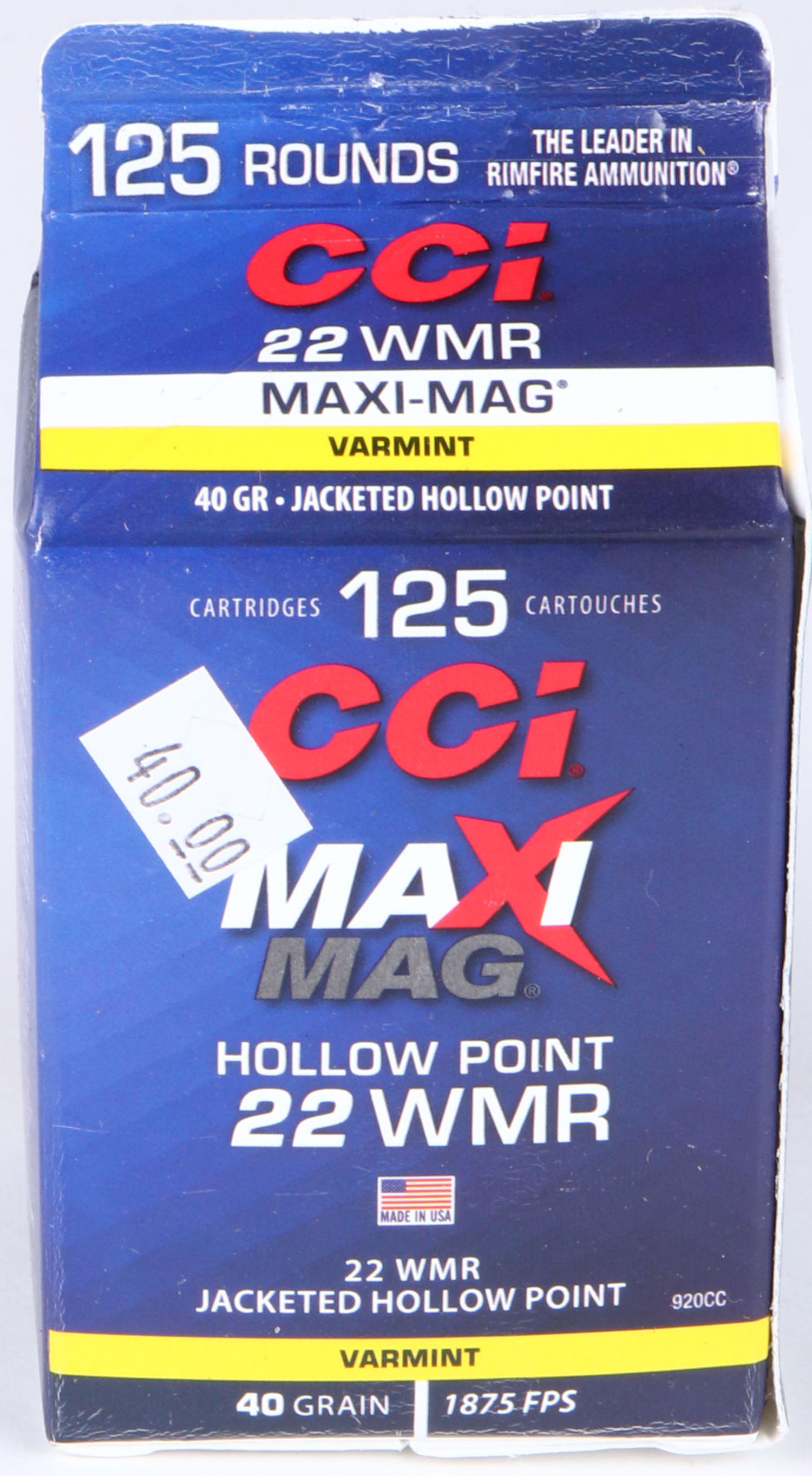 CCi, Maxi-Mag, .22 WMR Hollow Point, Varmint, FULL & SEALED, 125rds. 1pc. Blue milk carton, carton is near mint with minty color, only very minor wear on top, corners are sharp, edges are crisp. Grade: Excellent ++ - Value: 30 to 60