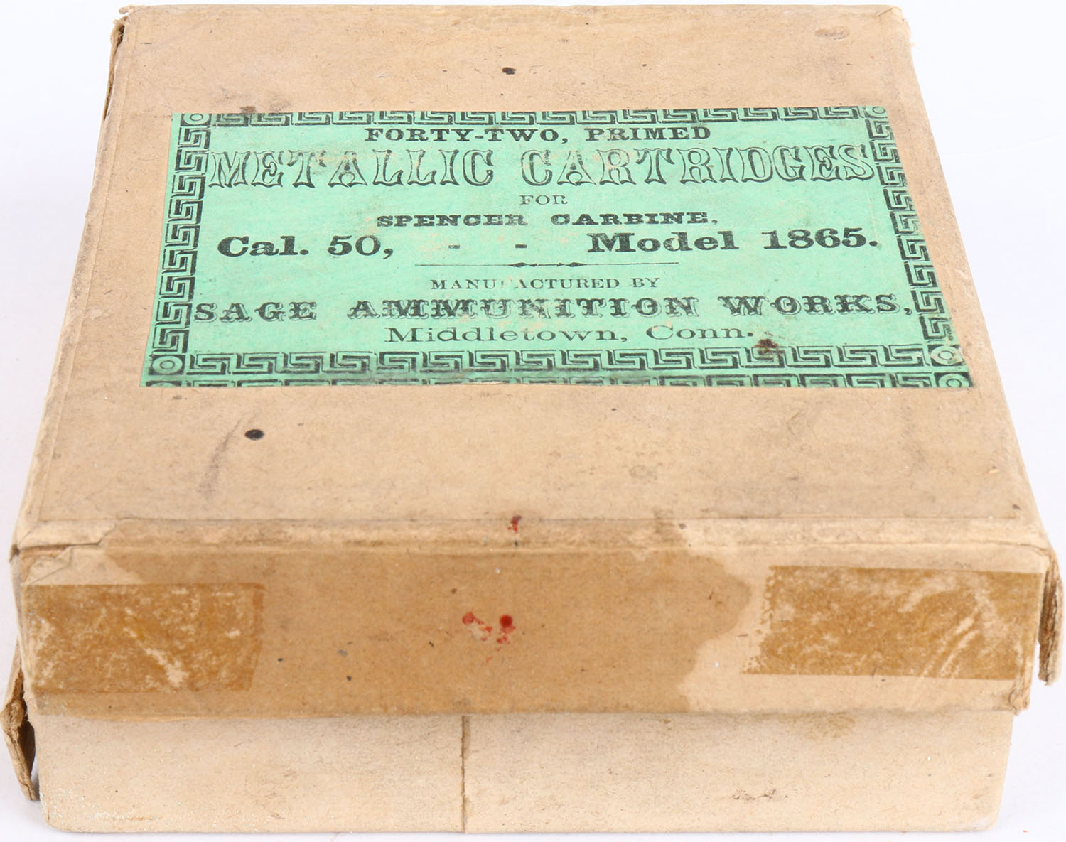 Sage Ammunition Works, Metallic Cartridges For Spencer Carbine, .50 Cal., Model 1865, Full, 2pc. Buff box with green top label, top has vertical seam splits on all 4 corners, complete seam split to left end of top, all 4 corners are taped, label has very good to excellent color, all (6) inside boxes are SEALED. Grade: Very Good + - Value: 100 to 500