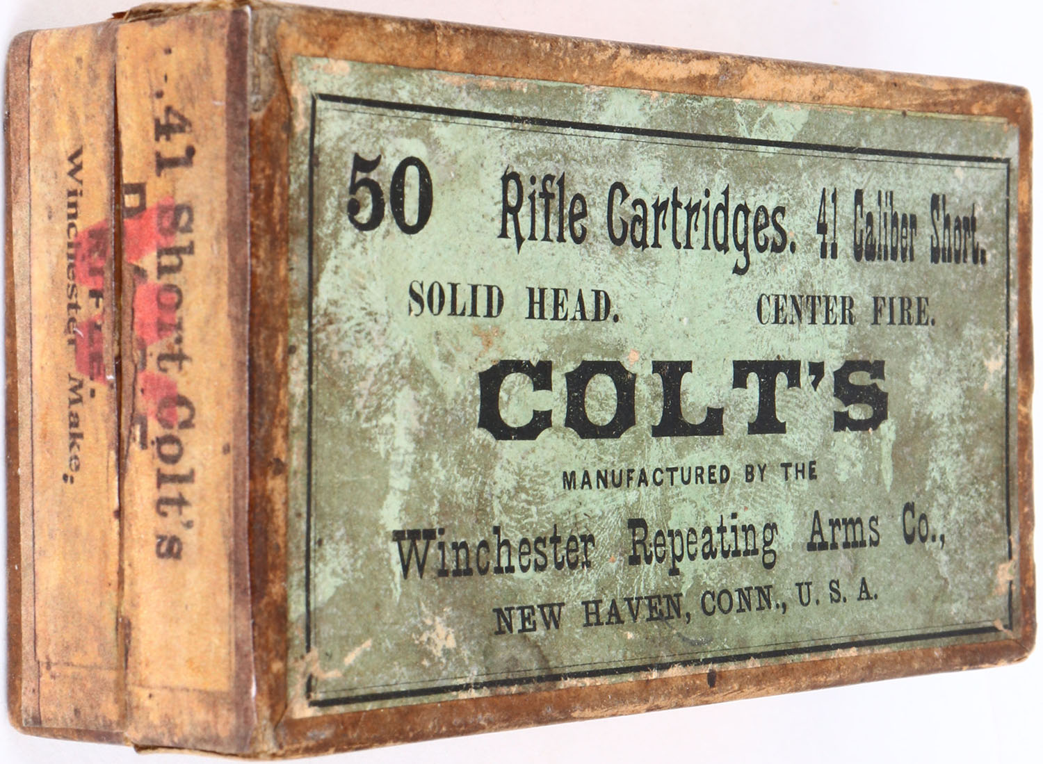 Winchester, Colt's, .41 Short Colt, Full, 2pc. Buff box with blue top & yellow side sealing labels, box is solid with good color, age soiling, shelf wear, side sealing label is sealed on back side, some edge & corner wear, side sealing label is 90% intact, ammo is very good to excellent. Grade: Very Good ++ - Value: 100 to 500