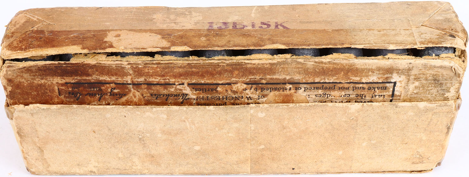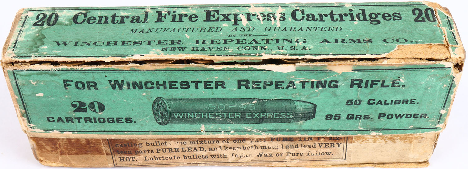 Winchester, .50-95 Express, 2pc., Full, Buff box with green label & black printing, box is solid with very good color, age soiling, edge wear, seam splits to bottom, partial seam split to front of lid, box has been written on, stains to the top and front, ammo is excellent. Grade: Very Good - Value: 800 to 1200