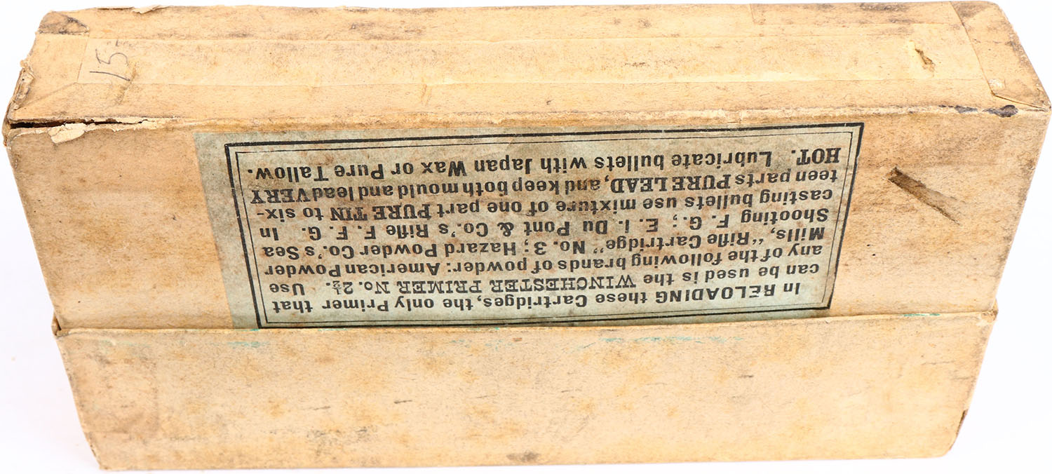 Winchester, .45-90-300, Model 1886, Full, 2pc. Buff box with green label, box is solid with excellent color, some age soiling, minor edge & corner wear, very minor shelf wear, labels are intact, ammo is excellent. Grade: Excellent + - Value: 200 to 400