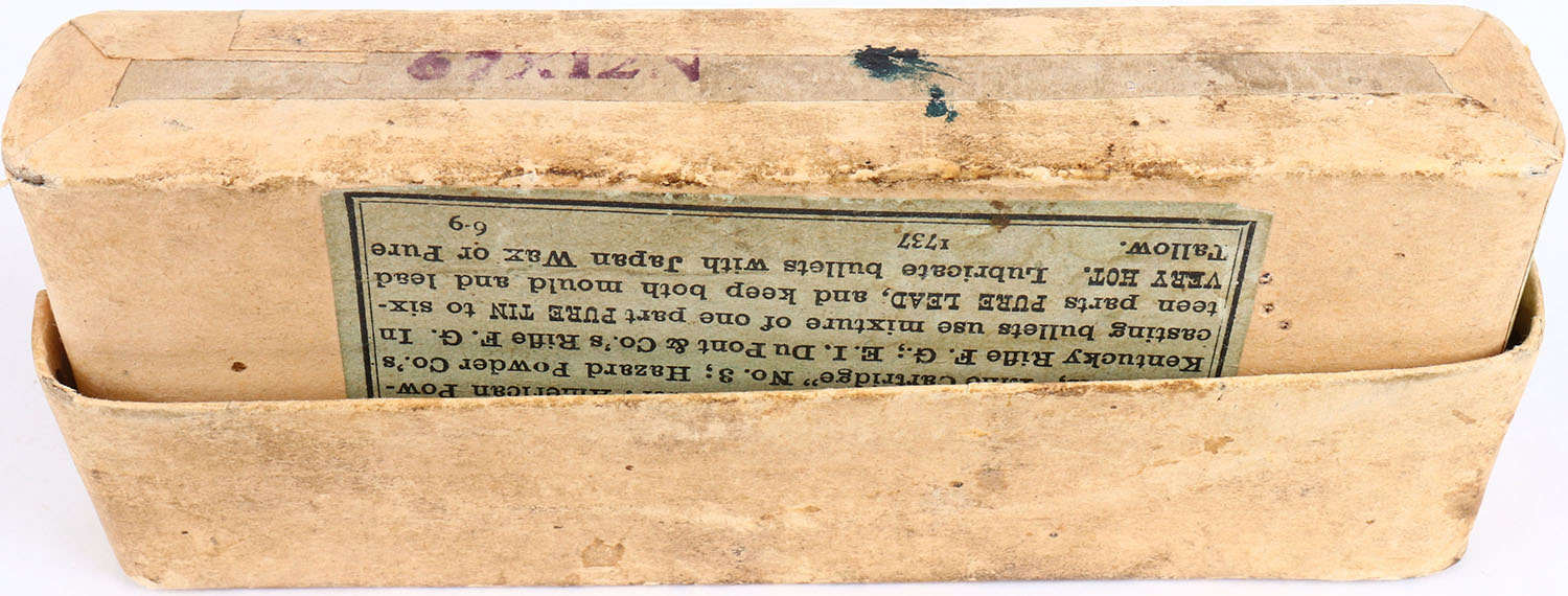 Winchester, .45-75, 350 Grain Bullet, Partial 11rds. Mixed Ammo, 2pc. Buff box with green labels, box is solid with very good color, some age soiling, shelf wear, some edge & corner wear, left end of lid is torn and missing a piece, label is 95% intact, ammo is very good. Grade: Very Good + - Value: 10 to 100