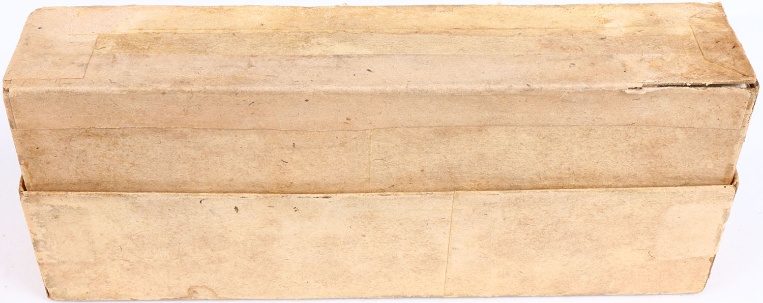 Winchester, .45-75, Model ''Centennial'' 1876, Full, 2pc. Buff box with green labels, box is solid with excellent color, some age soiling, seam split to bottom front edge, staining to top, some edge & corner wear, minor shelf wear, labels are intact, ammo is excellent. (1525) Grade: Very Good ++ - Value: 150 to 300