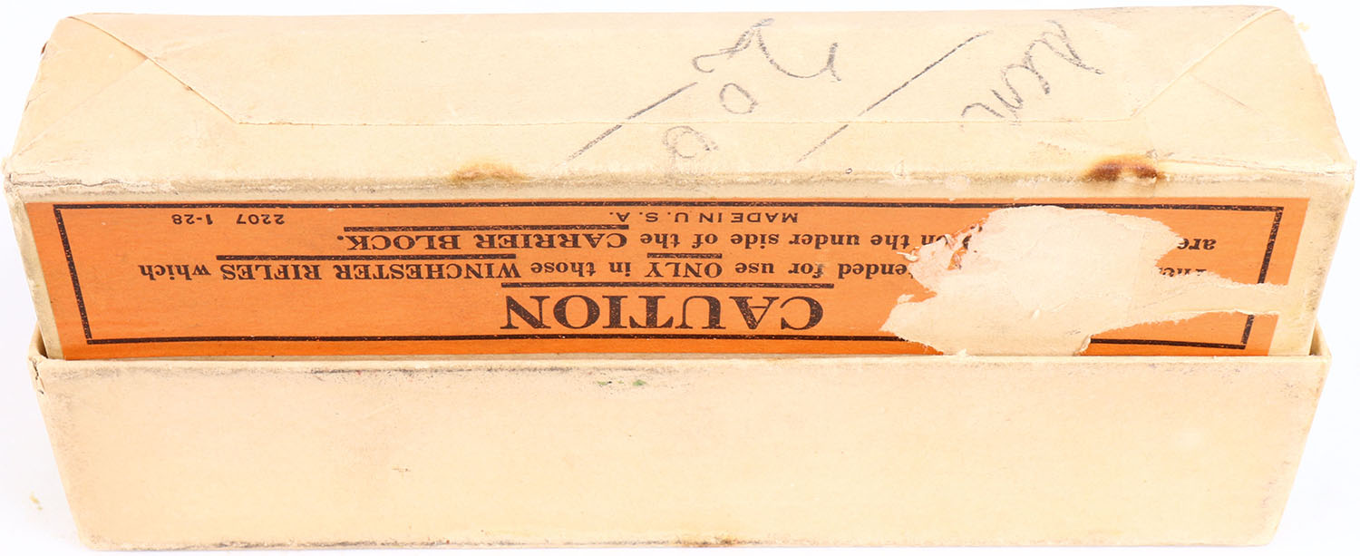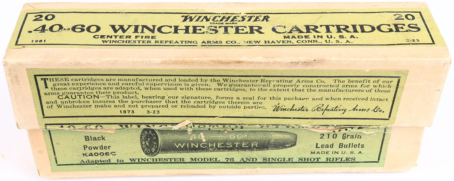 Winchester, .40-60, Black Powder, 210 Grain Lead Bullets, Full, 2pc. Buff box with green labels, box is solid with excellent color, very minor edge wear, corners are mostly sharp, labels are 99% intact, ammo is excellent. Grade: Excellent + - Value: 50 to 150