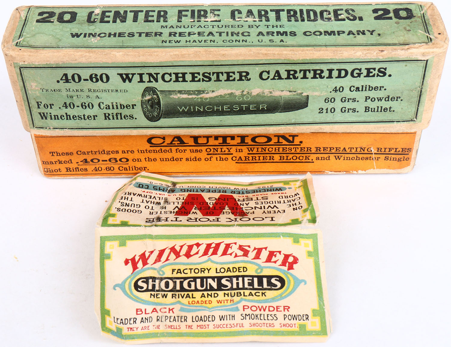 Winchester, .40-60-210, For Winchester Rifles, Full, 2pc. Buff box with green & orange labels, box is solid with excellent color, minor age soiling, minor shelf wear, corners are mostly sharp, edges are mostly crisp, some staining to top, back has been written on, labels are intact, ammo is excellent. Grade: Excellent ++ - Value: 100 to 300