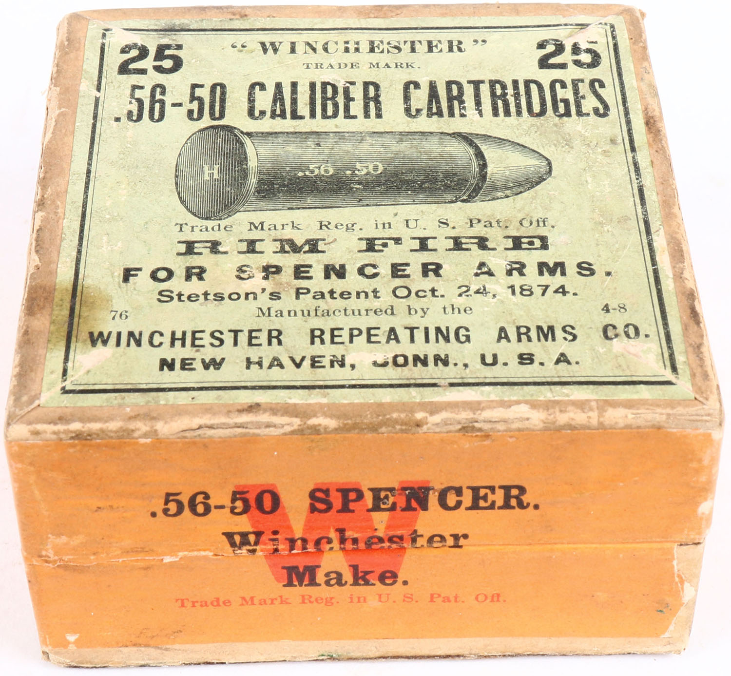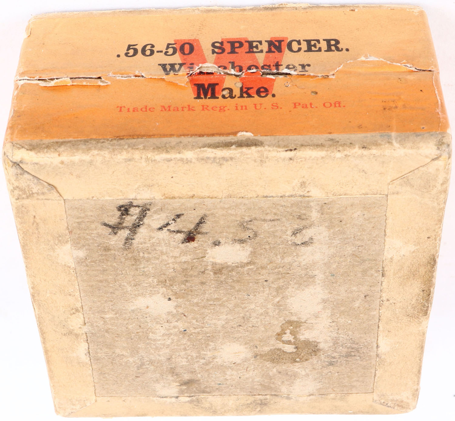 RARE! Winchester, .56-50 Rim Fire, For Spencer Arms, FULL & SEALED, 2pc. Buff box with green top & orange side sealing labels, box is solid with excellent color, some age soiling, stain on top, some shelf wear, very minor edge & corner wear, labels are intact. Grade: Excellent ++ - Value: 1200 to 3600