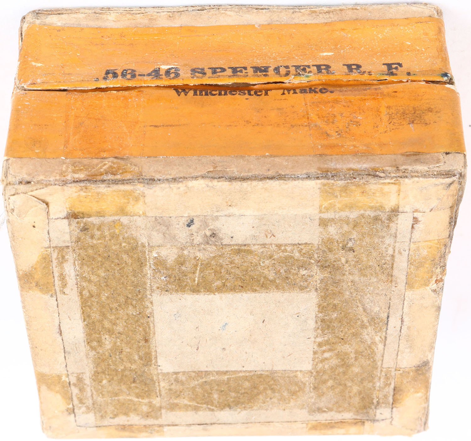 RARE! Winchester, Metallic Cartridges, 56-46, For Spencer Arms, Full, 2pc. Buff Box with green top & orange side sealing labels, box is solid with very good color, some age soiling, shelf wear, some edge & corner wear, bottom has tape on it, labels are intact, ammo is fair to good. Grade: Very Good ++ - Value: 800 to 2400
