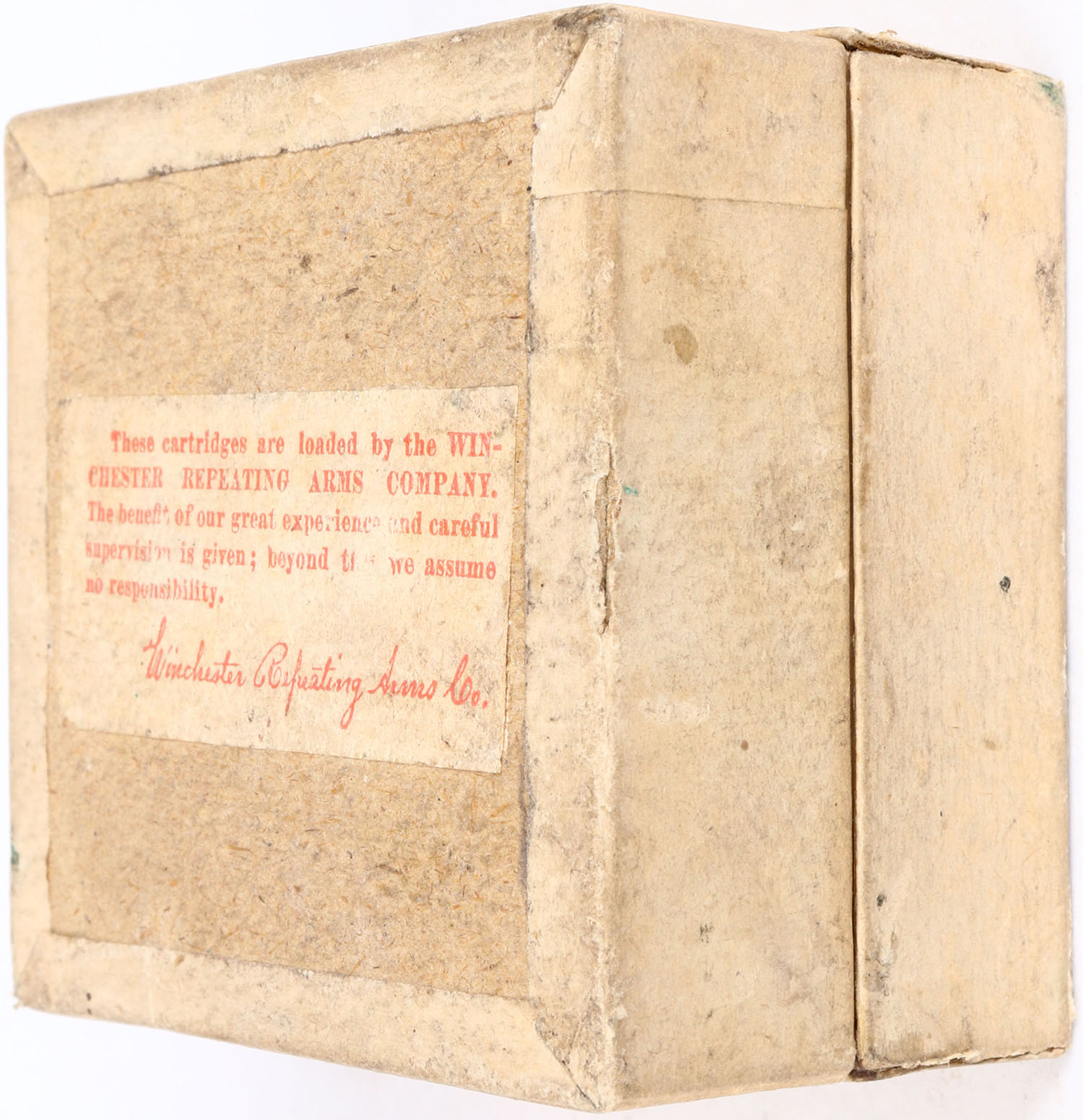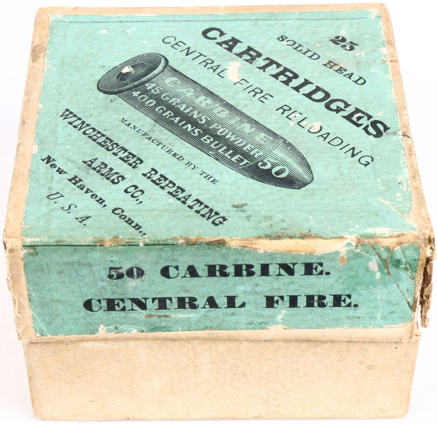Winchester, .50 Carbine, Solid Head Cartridges, 45 Grains Powder, 400 Grains Bullet, Partial 17rds., 2pc. Buff box with green label, box is solid with excellent color, minor age soiling, vertical seam split to both front corners of lid, minor edge & corner wear, label is intact, ammo is very good to excellent. Grade: Excellent - Value: 200 to 600