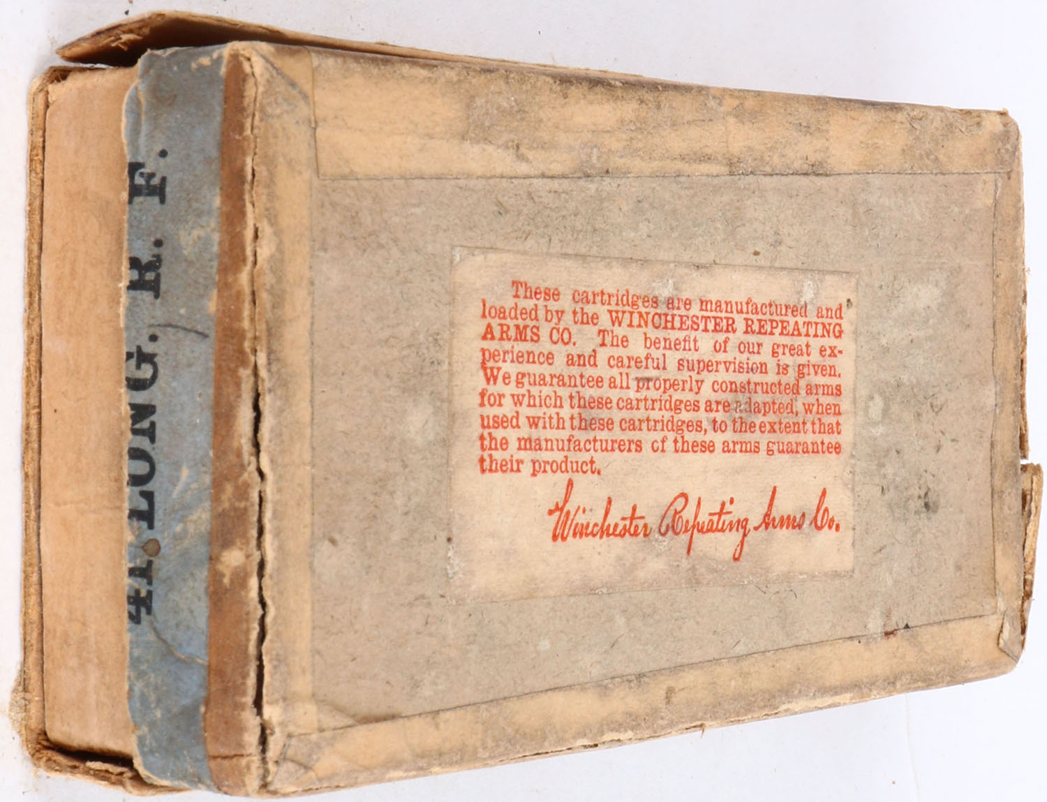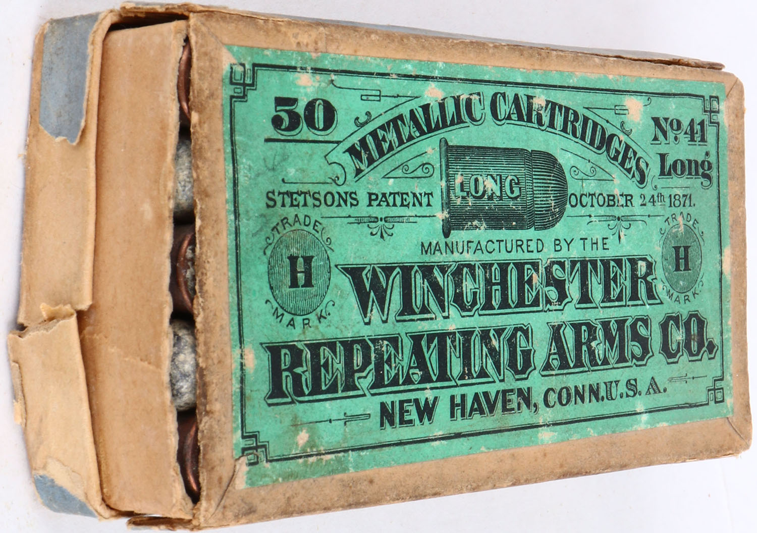 Winchester, Metallic Cartridges, .41 Long Rim Fire, Full, 2pc. Buff box with green top & blue side sealing labels, both ends of lid are torn off, very good to excellent color, minor age soiling & shelf wear, some edge & corner wear, labels are intact, ammo is very good. Grade: Very Good - Value: 50 to 150