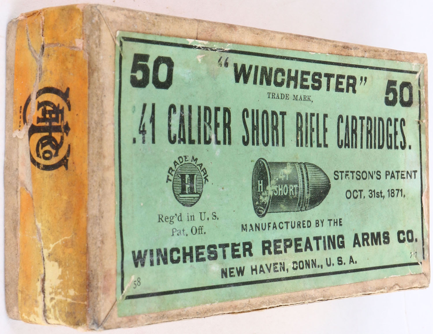 Winchester, .41 Short Rim Fire, FULL & SEALED, 2pc. Buff box with green top & orange side sealing labels, box is solid with very good color, minor age soiling & color fading, seam split to top front edge, staining to front and back sides, labels are intact. Grade: Excellent - Value: 200 to 400