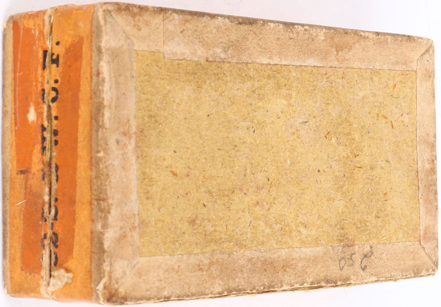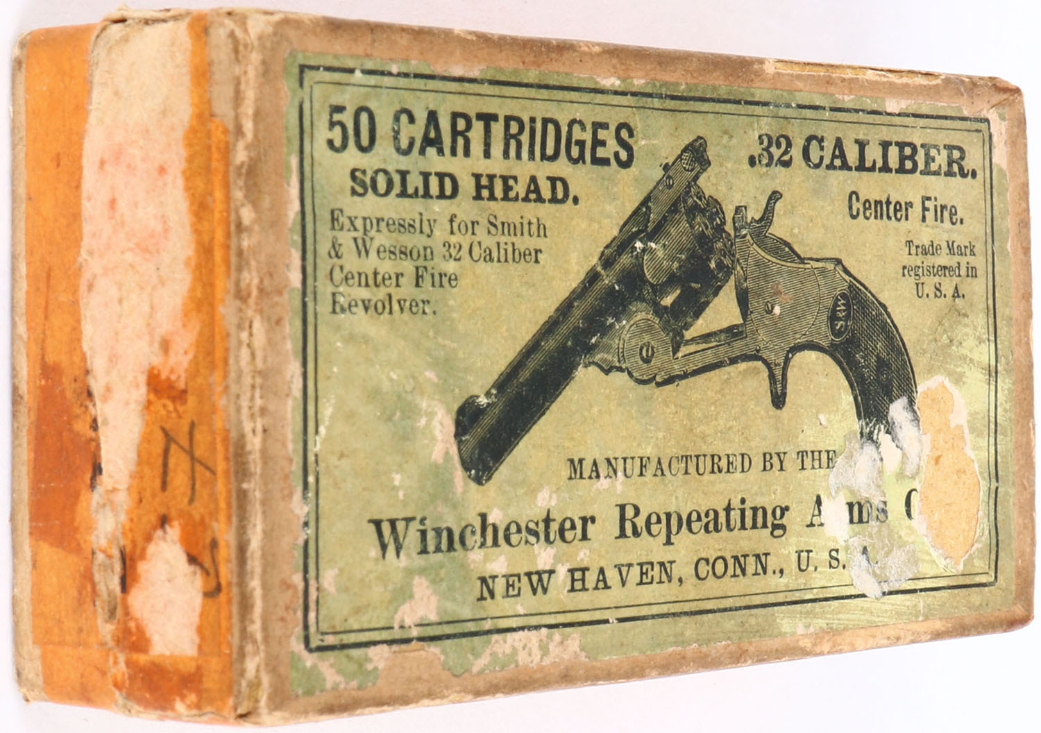 Winchester, .32 Smith & Wesson, Solid Head, Full, 2pc. Buff box with green top & orange side sealing labels, box is solid with very good color, age soiling, minor shelf & edge wear, small tear on top label, labels are 95% intact, left end has been written on, ammo is excellent. (996) Grade: Very Good ++ - Value: 30 to 90