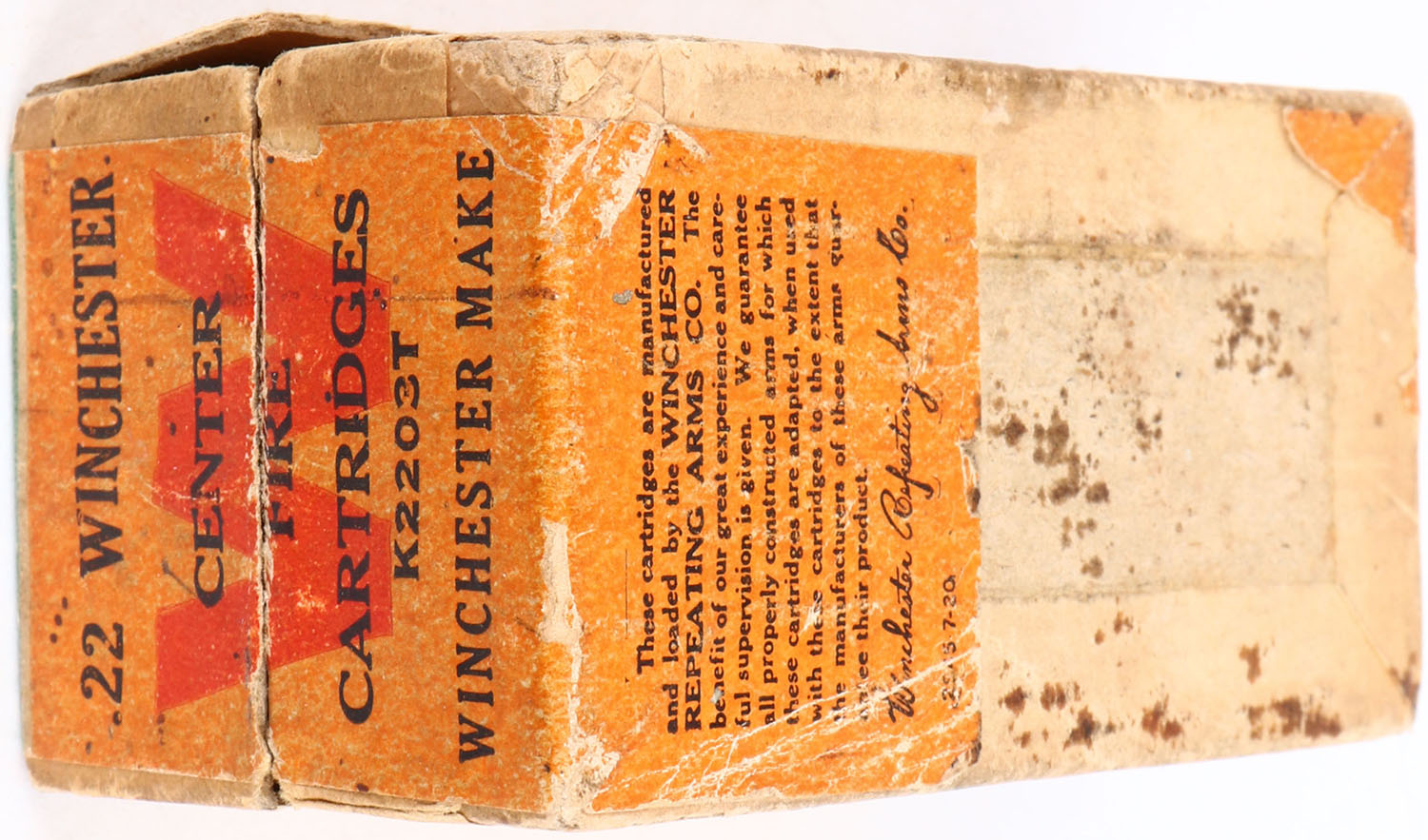 Winchester, .22 Winchester, 45 Grain Bullet, Full, 2pc. Buff box with orange and green labels, box has age soiling and 1 corner ding, some age soiling and scuffing to labels, ammo is very good to excellent. Grade: Very Good - Value: 50 to 150
