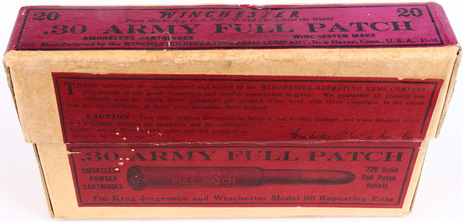 Winchester, .30 Army (30-40 Krag), Smokeless Powder, 220 Grain Full Patch Bullet, Full, 2pc. Buff box with dark red labels, box is solid, some scuffing to top label, ammo is excellent. Grade: Excellent - Value: 50 to 150