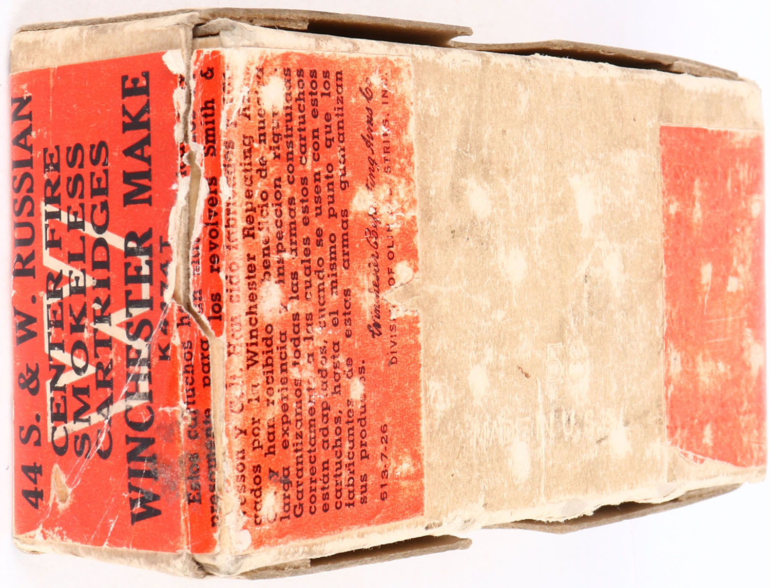 Winchester, .44 Smith & Wesson, Smokeless Powder, FULL, 2pc. Buff box with red label, box has scuffing, some scuffing to labels, Ammo is excellent. Grade: Very Good ++ - Value: 100 to 500