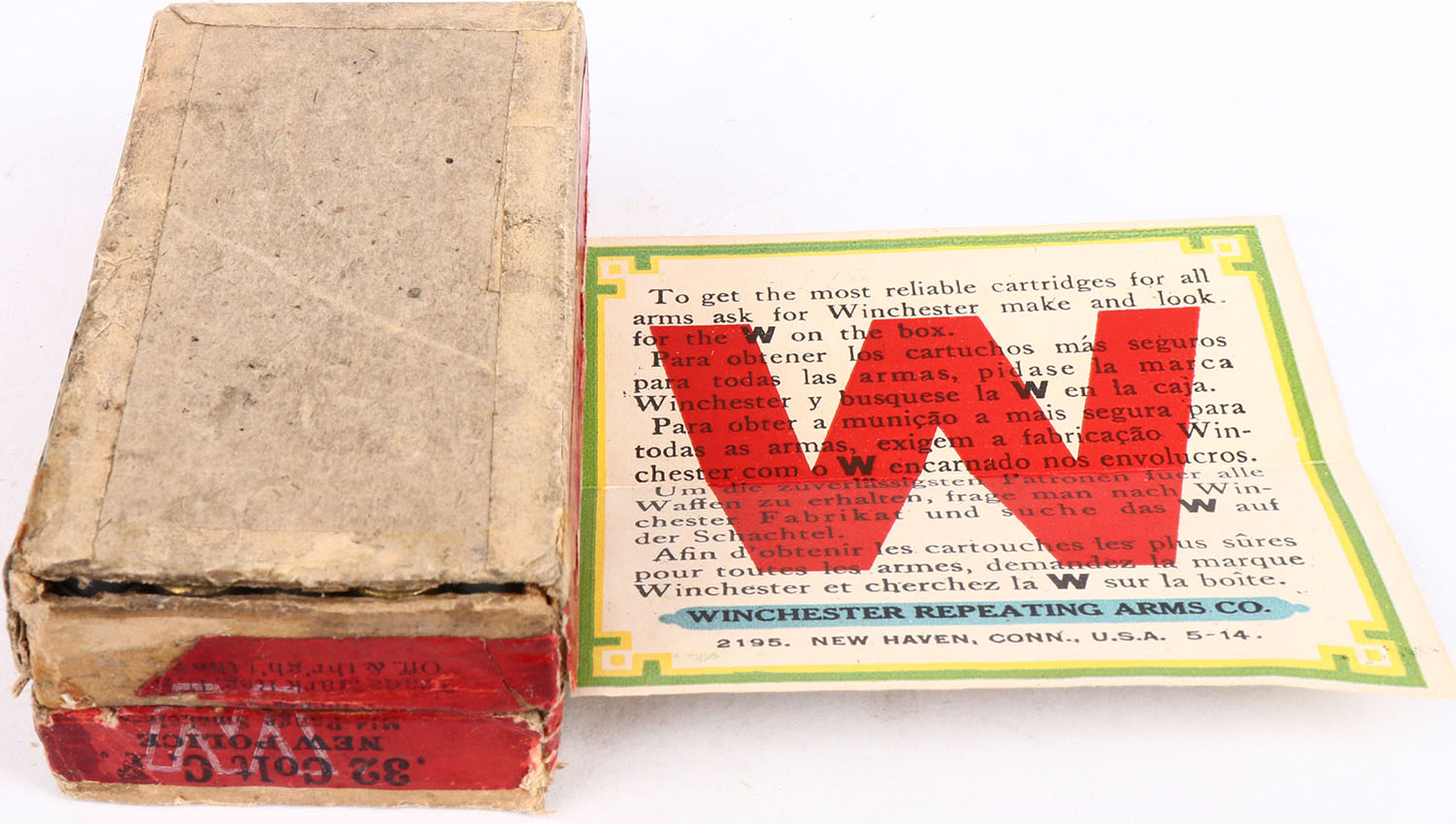 Winchester, .32 Colt New Police, Mid-Range Smokeless Cartridges, Full - with insert, 2pc. Buff box with red top & side sealing labels, box is seam split on bottom and opens from the bottom, box has very good color, some age soiling & fading, edge & corner wear, labels are 90% intact, insert is excellent, ammo is excellent. Grade: Good ++ - Value: 20 to 60