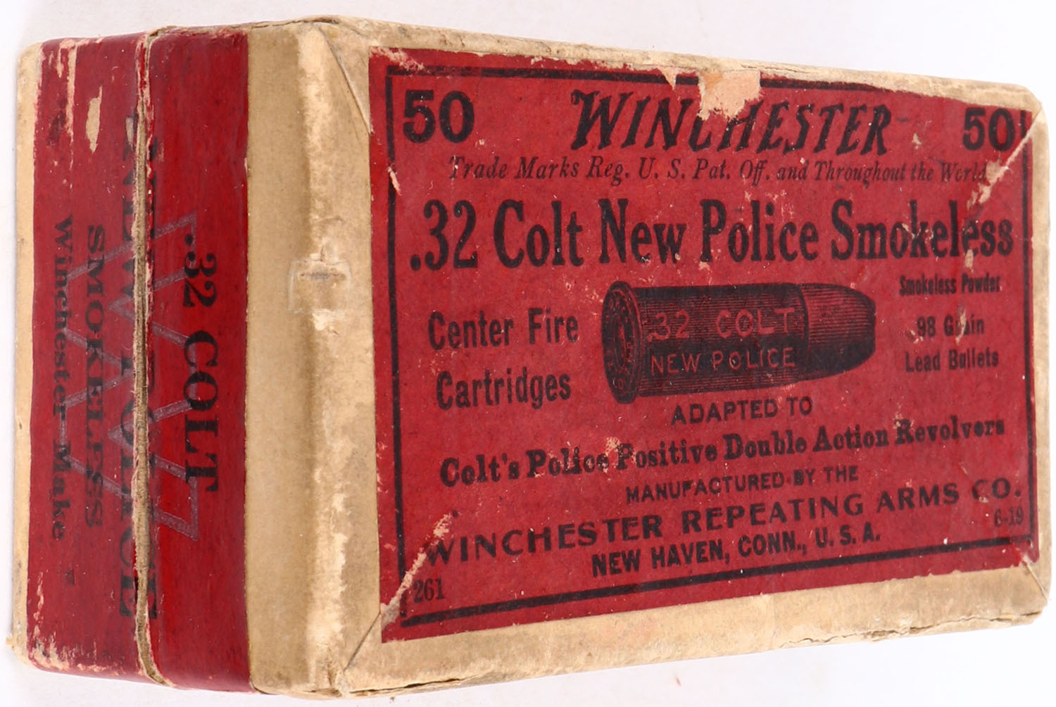 Winchester, .32 Colt New Police, Smokeless Powder, 98 Grain Lead Bullets, Full, 2pc. Buff box with red top & side sealing labels, box is solid with excellent color, some age soiling & shelf wear, edge & corner wear, labels are intact, ammo is excellent. Grade: Excellent - Value: 30 to 90