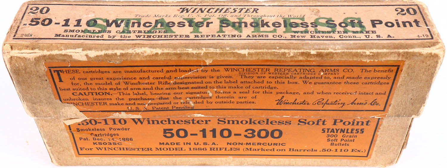 Winchester, Staynless, .50-110-300 Winchester Smokeless Soft Point, Full, 2pc. Buff box with orange labels and ''Staynless'' Over-Stamp, box is solid with very good color, age soiling, some color fading to top, 2 vertical seam splits to right end of lid, one has been repaired, some shelf wear, edge & corner wear, back has been written on, labels are intact, ammo is excellent. Grade: Excellent - Value: 100 to 300