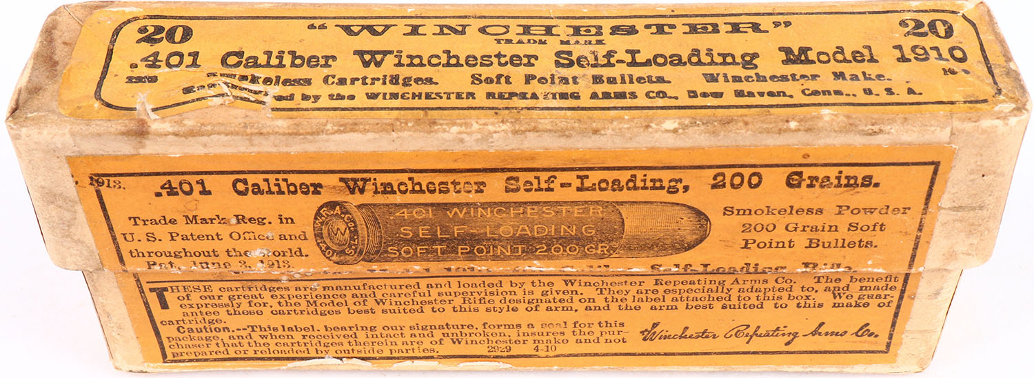 Winchester, .401 Winchester Self-Loading, Smokeless Powder, 200 Grain Soft Point Bullets, Full, 2pc. Buff box with orange labels, box is solid with excellent color, some age soiling, very minor edge & corner wear, small crease to top label, labels are intact, ammo is excellent to minty. Grade: Excellent + - Value: 50 to 150