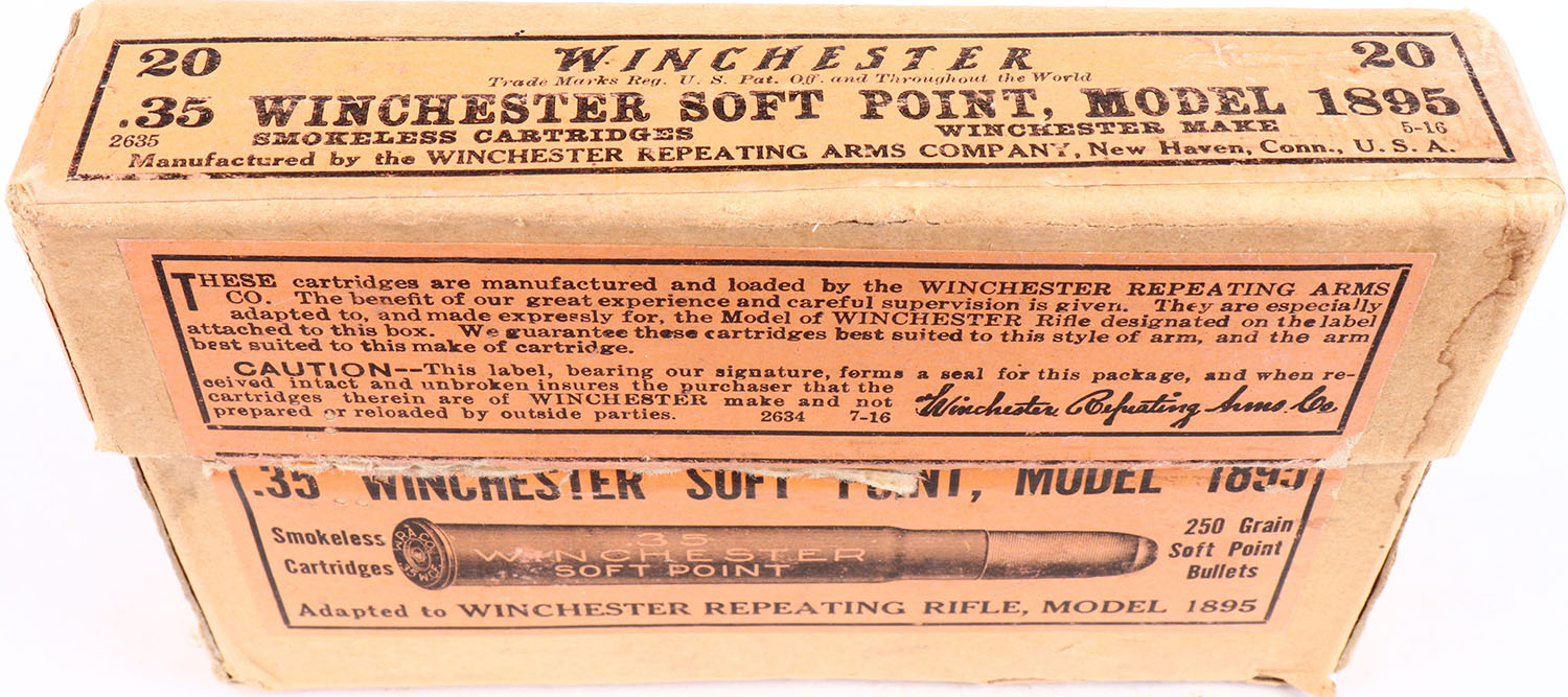 Winchester, .35 Winchester Model 1895, Smokeless, 250 Grain Soft Point Bullets, Full, 2pc. Buff box with excellent color, very minor age soiling & staining to front side, tear on bottom, very minor edge & corner wear, back has been written on, ammo is very good. Grade: Very Good ++ - Value: 50 to 150