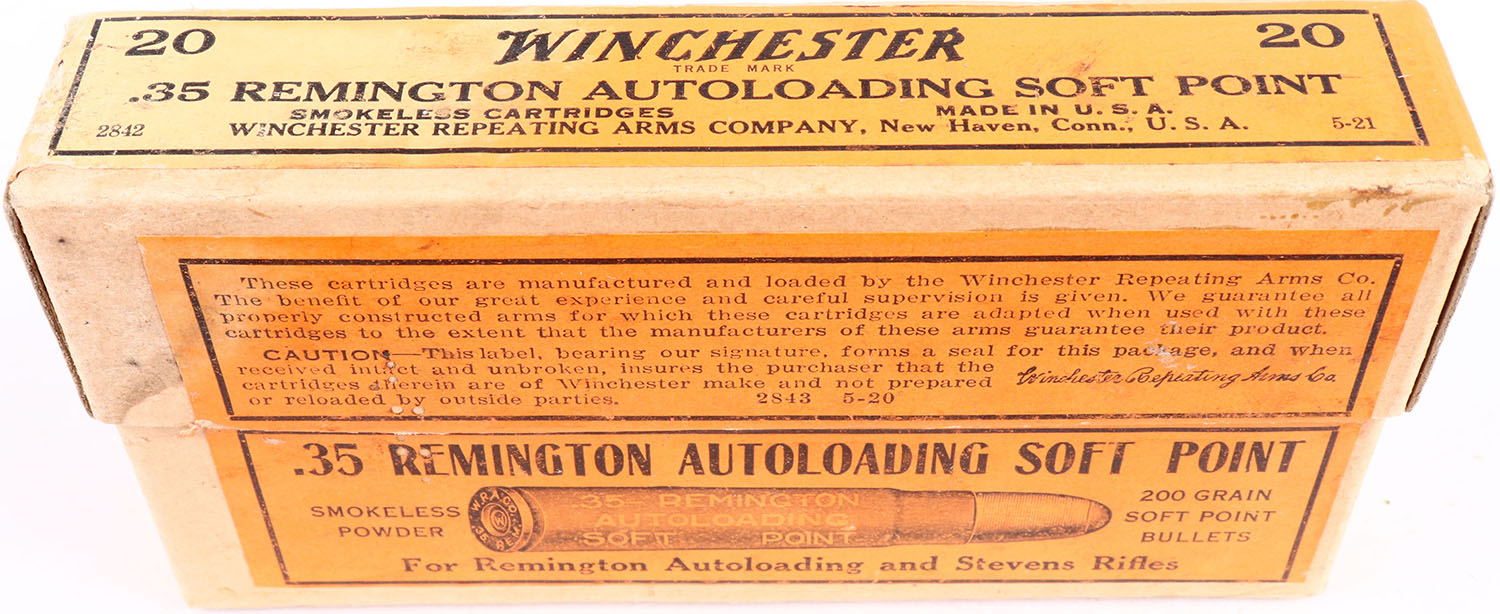Winchester, .35 Remington Autoloading, Smokeless Powder, 200 Grain Soft Point Bullets, FULL & SEALED, 2pc. Buff box with orange labels, box is solid with very good to excellent color, very minor age soiling, some color fading to left side of box, staining to back, very minor staining to front, very minor corner wear, edges are mostly crisp, labels are intact. Grade: Excellent + - Value: 40 to 120