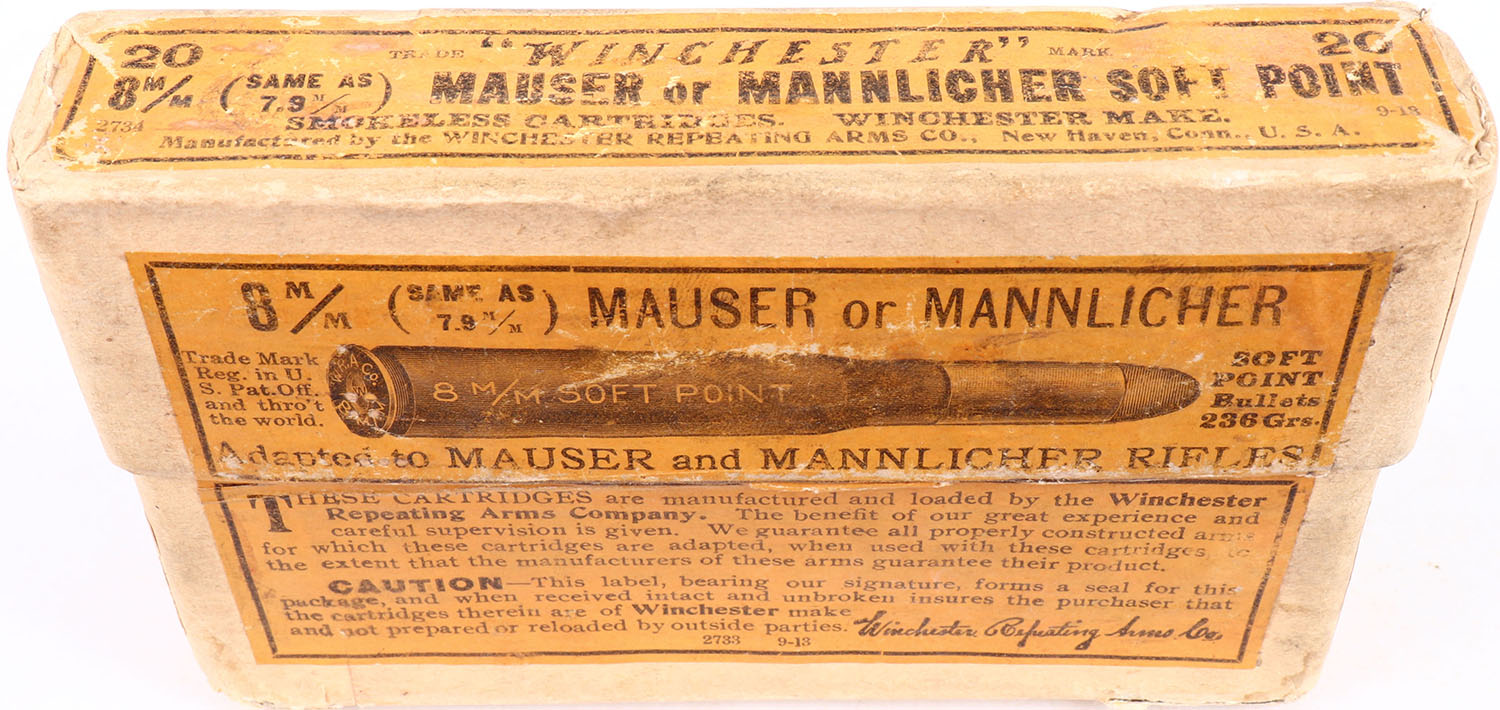 Winchester, 8mm Mauser or Mannlicher, 236 Grs. Soft Point Bullet, Adapted to Mauser and Mannlicher Rifles, Full, 2pc. Buff box with orange labels, box is solid, with very good to excellent color, some age soiling & shelf wear, partial seam splits to both ends of bottom, staining to back side, minor edge & corner wear, bottom has been written on, ammo is good to very good. Grade: Very Good ++ - Value: 30 to 90