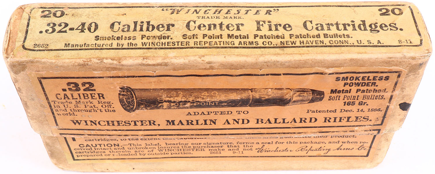 Winchester, .32-40 Caliber, Smokeless Powder, 165 Gr. Metal Patched Soft Point Bullets, FULL & SEALED, 2pc. Buff box with orange labels, box is solid with very good color, age soiling, color fading to labels, some staining to all sides, minor shelf wear, very minor edge & corner wear, labels are intact. Grade: Excellent - Value: 80 to 240