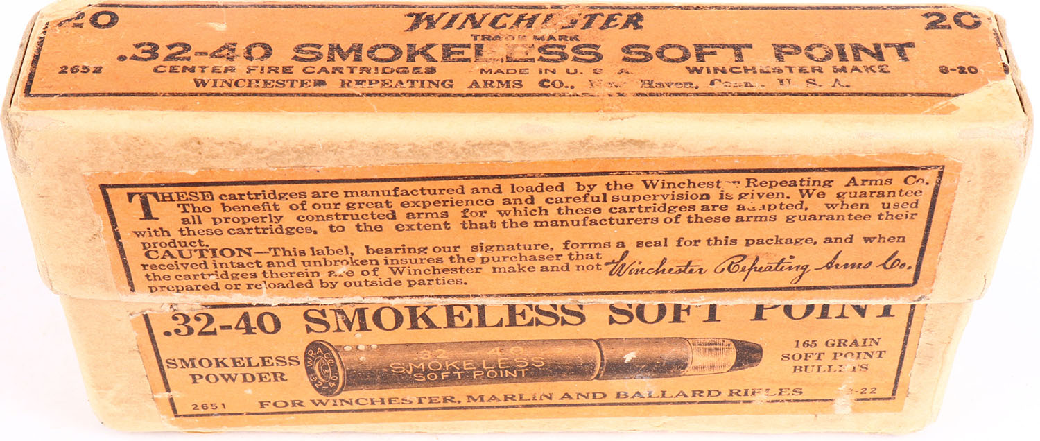 Winchester, .32-40, Smokeless Powder, 165 Grain Soft Point Bullets, Full of mixed ammo, 2pc. Buff box with orange labels, box is solid with excellent color, minor age soiling & shelf wear, some edge & corner wear, labels are intact, ammo is excellent to minty. Grade: Very Good ++ - Value: 10 to 50