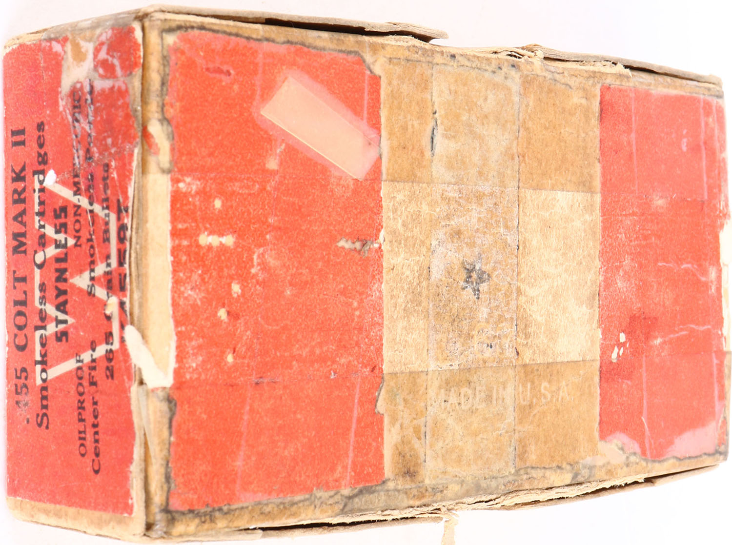 Winchester, Staynless, .455 Colt Mark II, 265 Grain Bullets, Full, 2pc. Buff box with orange wraparound label, box is solid with very good color, age soiling, some shelf wear, minor edge & corner wear, partial seam split to top front edge, tray of box is covered in tape, lid has tape on all sides and ends, label is intact, ammo is very good. Grade: Very Good + - Value: 50 to 300