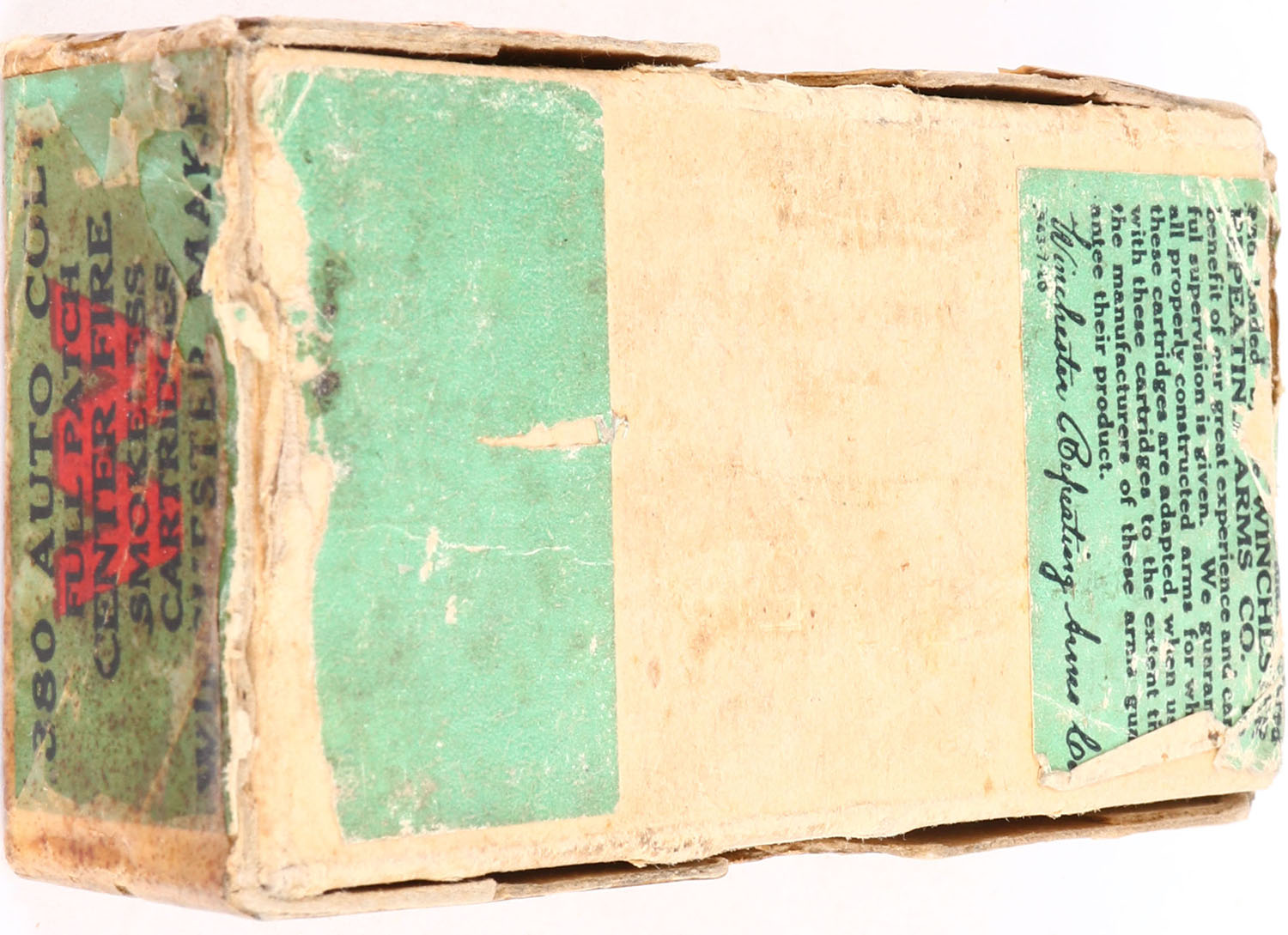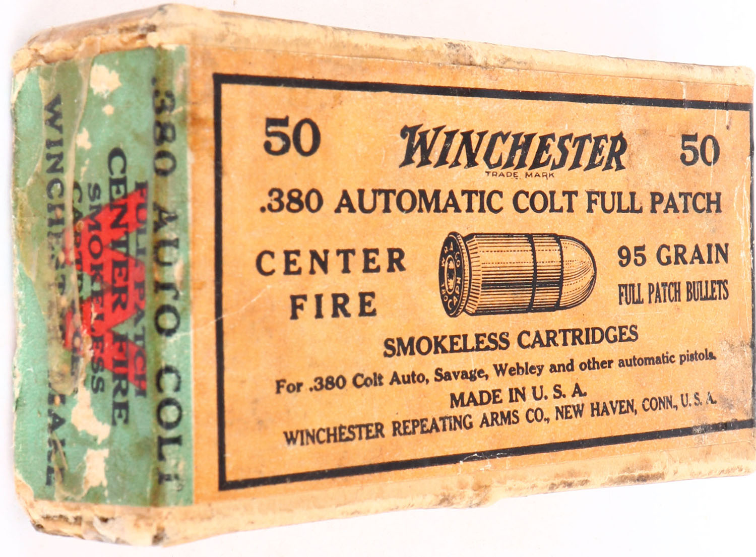 Winchester, .380 Automatic Colt, Smokeless Cartridges, 95 Grain Full Patch Bullets, Full, 2pc. Buff box with orange & green wraparound label, box is solid with very good color, age soiling, minor shelf wear, tape on front and back side of lid, some edge & corner wear, label is intact, ammo is excellent. Grade: Very Good + - Value: 20 to 80
