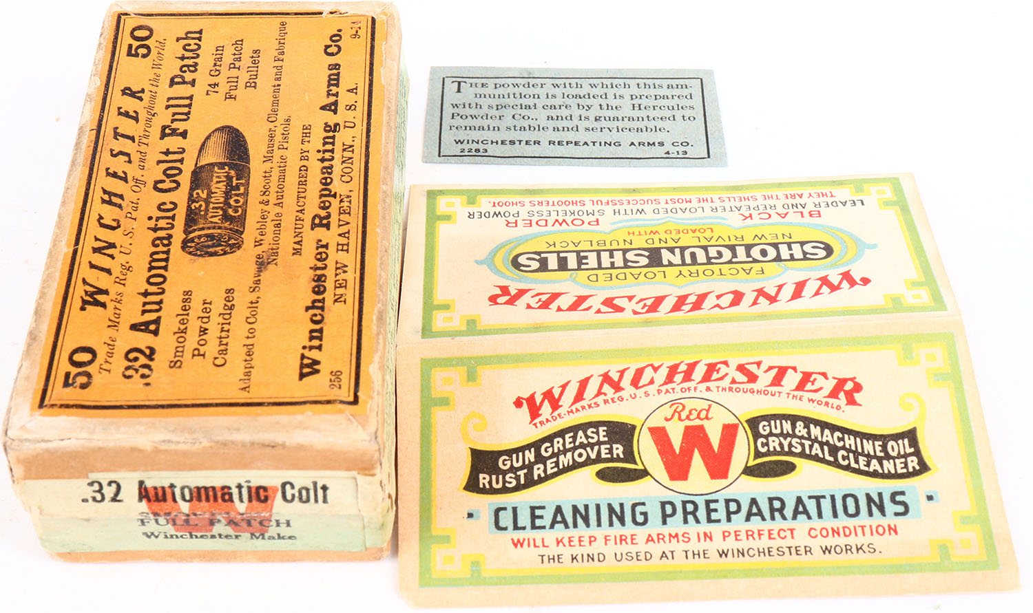 Winchester, .32 Automatic Colt, Smokeless Powder, 74 Grain Full Patch Bullets, Full with inserts, 2pc. Buff box with orange top & green side sealing labels, box is solid with very good to excellent color, minor age soiling & color fading, 2 vertical seam splits to left end of lid, minor edge & corner wear, labels are intact, inserts are excellent, ammo is excellent. Grade: Excellent - Value: 20 to 80