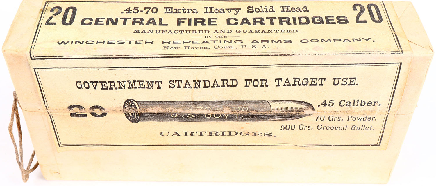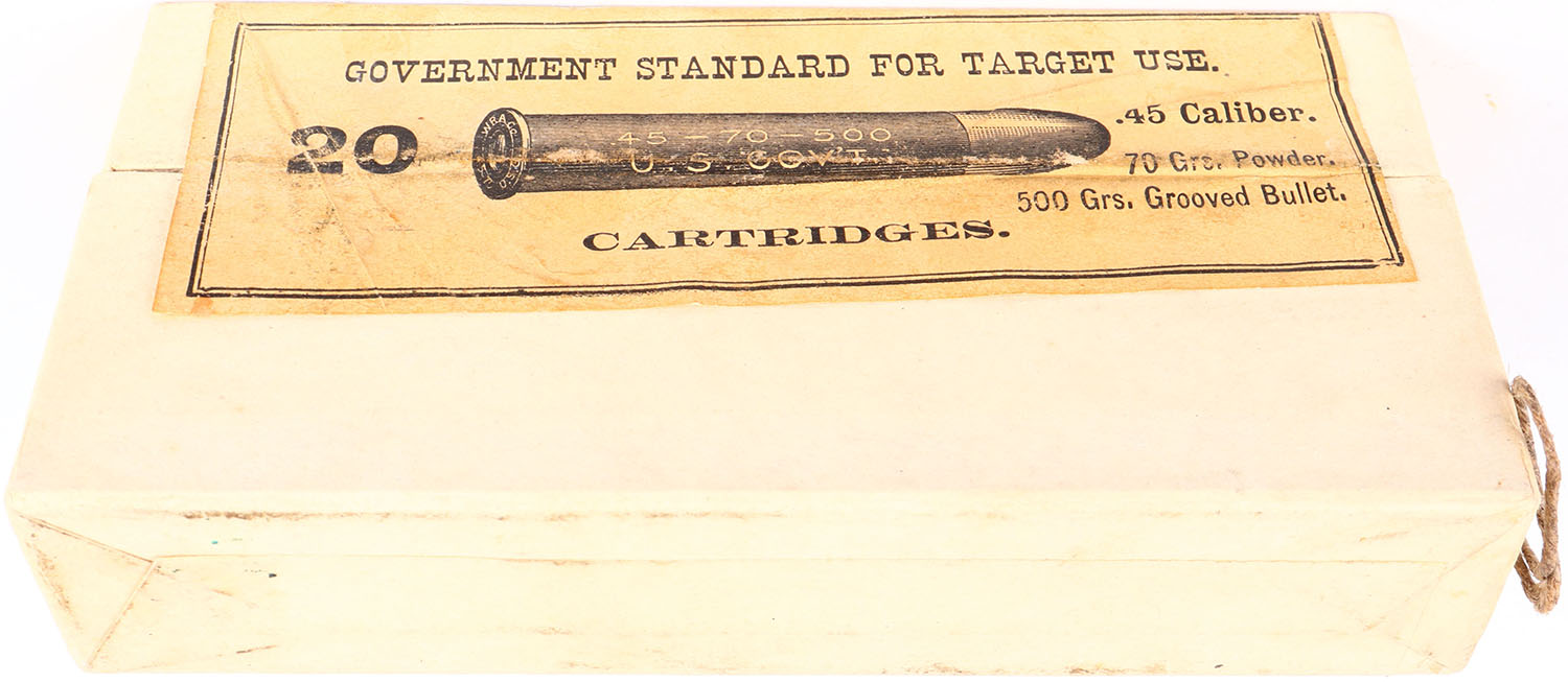 Winchester, .45-70 Extra Heavy Solid Head, 500 Grs. Grooved Bullet, Government Standard For Target Use, FULL & SEALED, 2pc. Buff box with buff label, box is solid with very good to excellent color, some age soiling & color fading, very minor corner wear, edges are crisp, label is intact. Grade: Excellent ++ - Value: 100 to 300