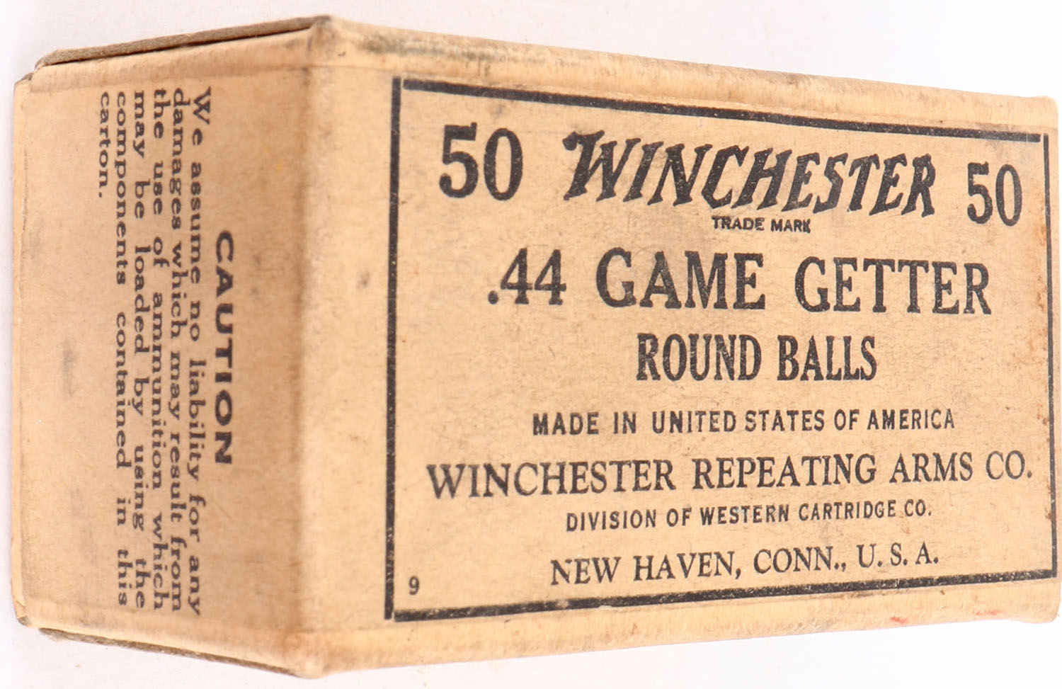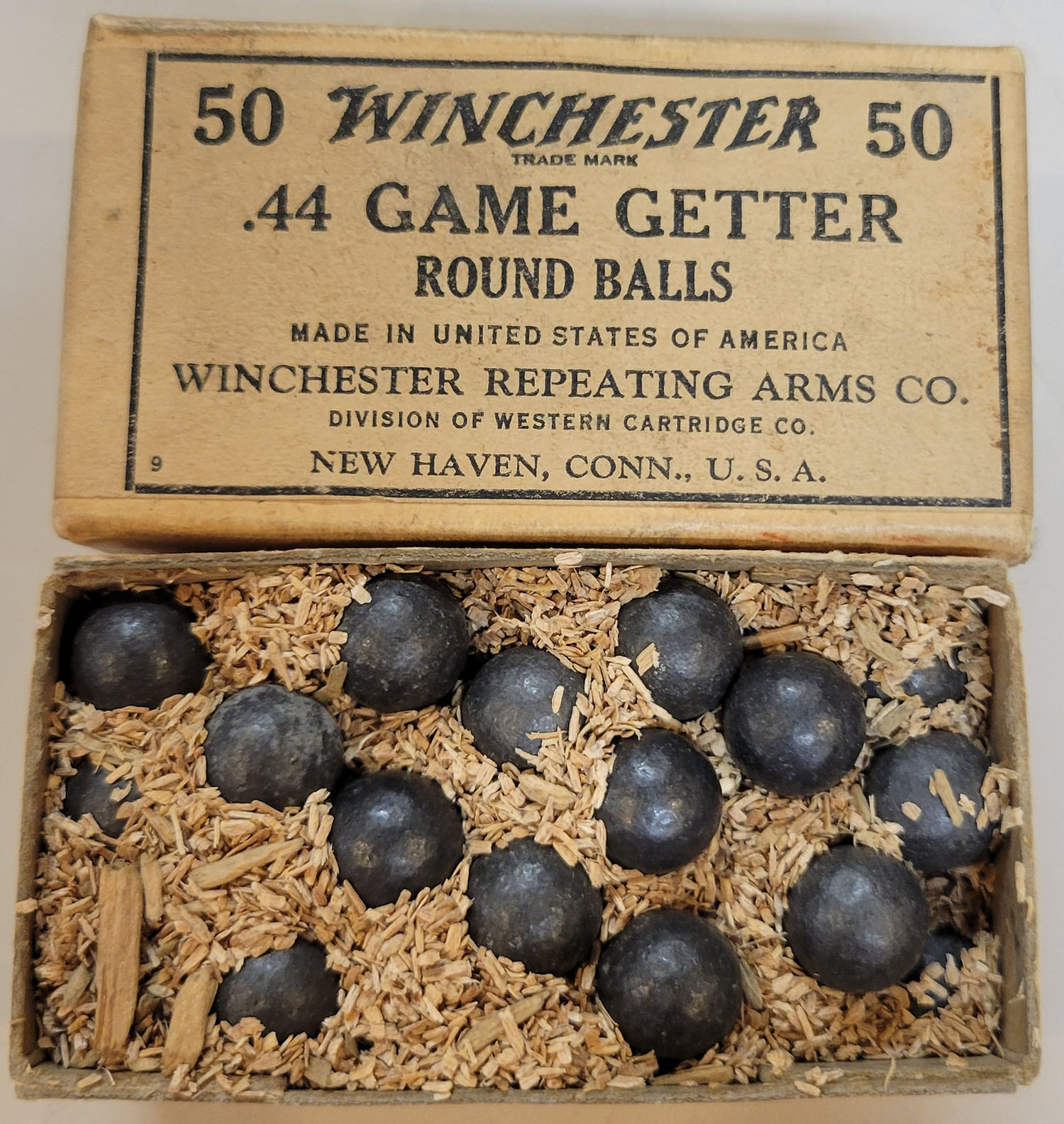 Winchester, .44 Game Getter, Round Balls (PROJECTILES ONLY), Full, 2pc. Buff box with buff wraparound label, box is solid with excellent color, minor age soiling, very minor corner wear, edges are mostly crisp, label is intact, ammo is excellent. Grade: Excellent + - Value: 40 to 600