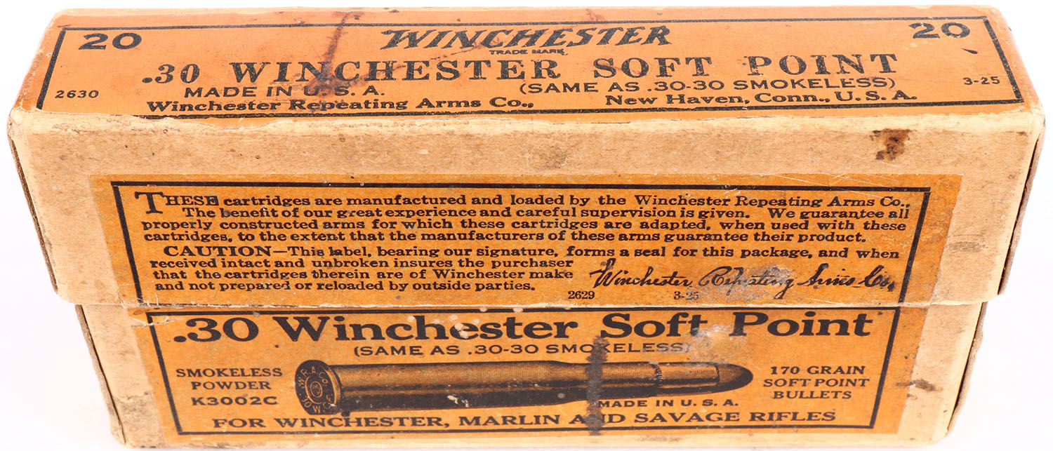Winchester, .30 Winchester (.30-30), Smokeless Powder, 170 Grain Soft Point Bullets, Full, 2pc. Buff box with orange labels, box is solid with very good color, some age soiling & color fading, staining to front back & top, minor edge & corner wear, labels are intact, ammo is excellent. Grade: Excellent - Value: 20 to 80