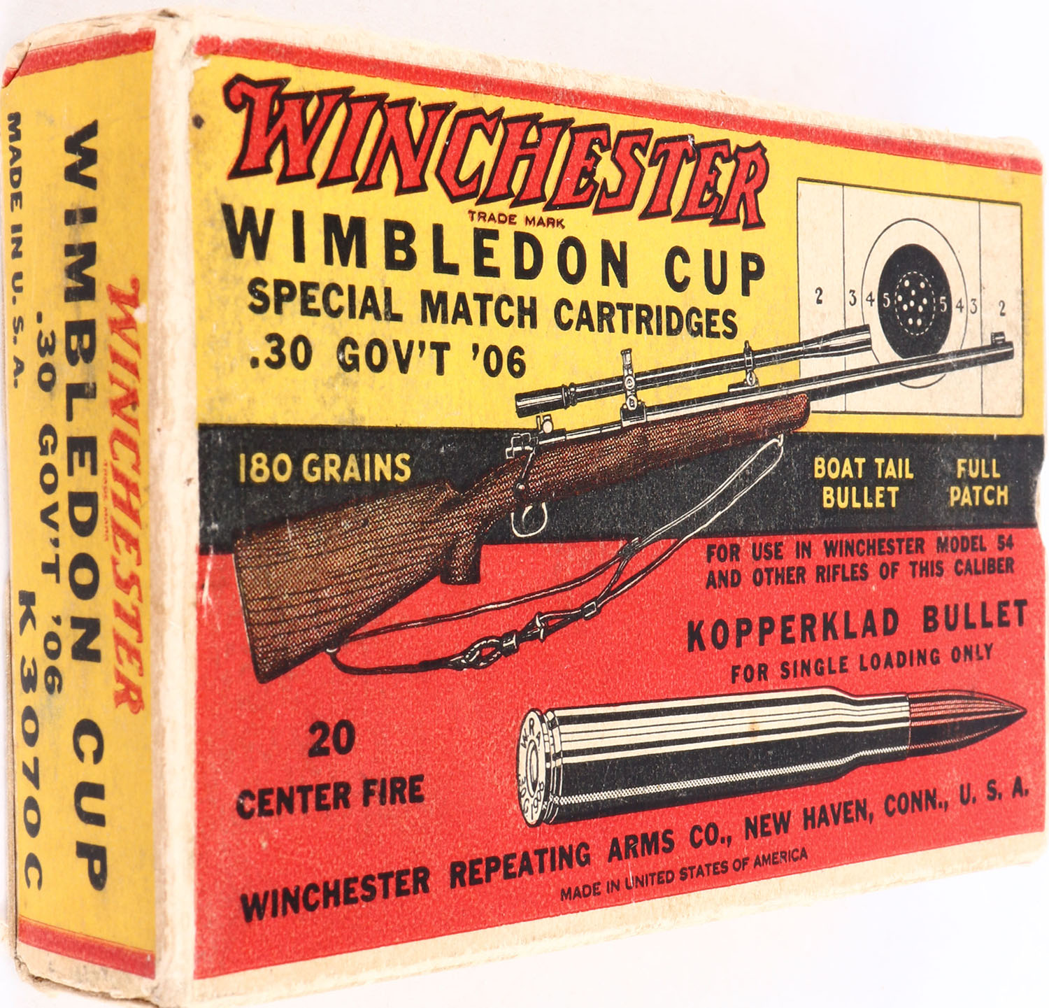 Winchester, Wimbledon Cup Special Match Cartridges, .30 Gov't '06, 180 Grain Kopperklad Full Patch Boat Tail Bullet, For Single Loading Only, Full, 1pc. Red yellow & black box, box is solid with very good to excellent color, minor age soiling, very some edge wear, corner wear, end flaps are solid, ammo is excellent. Grade: Excellent + - Value: 100 to 300