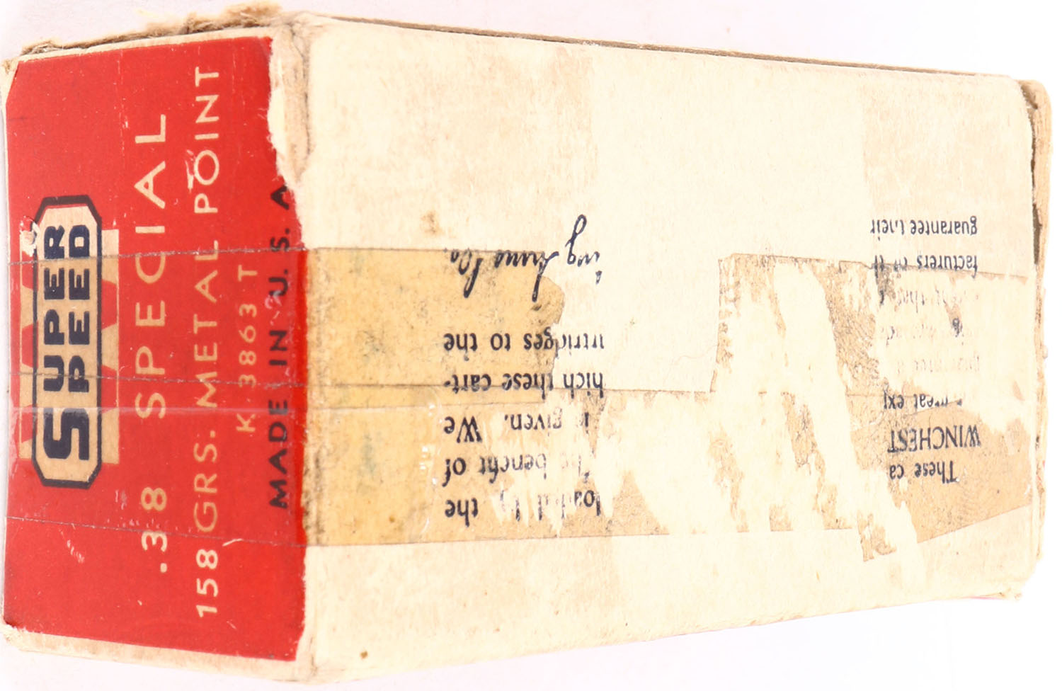 Winchester, Super Speed, .38 Special, 158 Grs. Metal Point, Full, 1pc. Blue red & white box, box has very good to excellent color, left end flap is torn off, minor age soiling, tape damage to top left end and bottom, tape on top right end & bottom, edge & corner wear, ammo is excellent. Grade: Good ++ - Value: 50 to 300