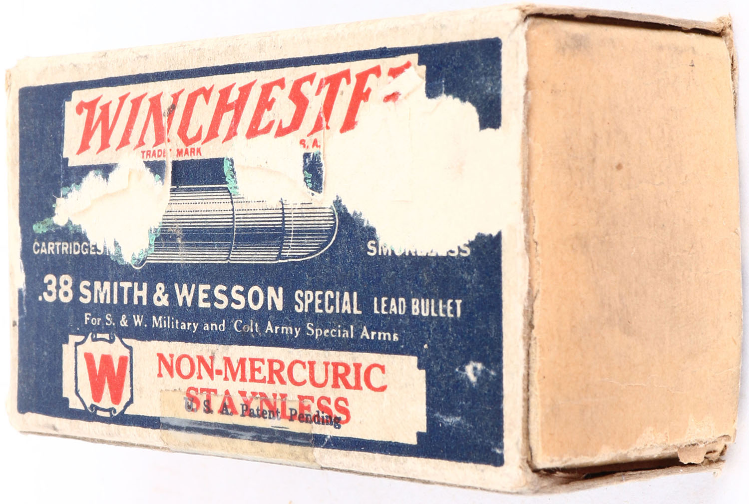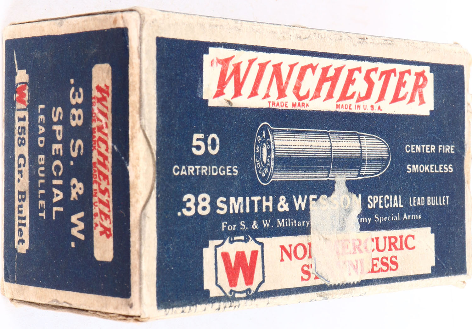 Winchester, Non-Mercuric Staynless, .38 Smith & Wesson Special, 158 Grain Lead Bullet, Full, 1pc. Blue white & red box, box is solid with excellent color, minor age soiling, right end flap is torn off, tape damage to front, minor corner wear, very minor edge wear, ammo is excellent. Grade: Very Good + - Value: 20 to 60