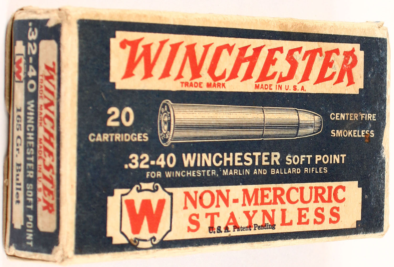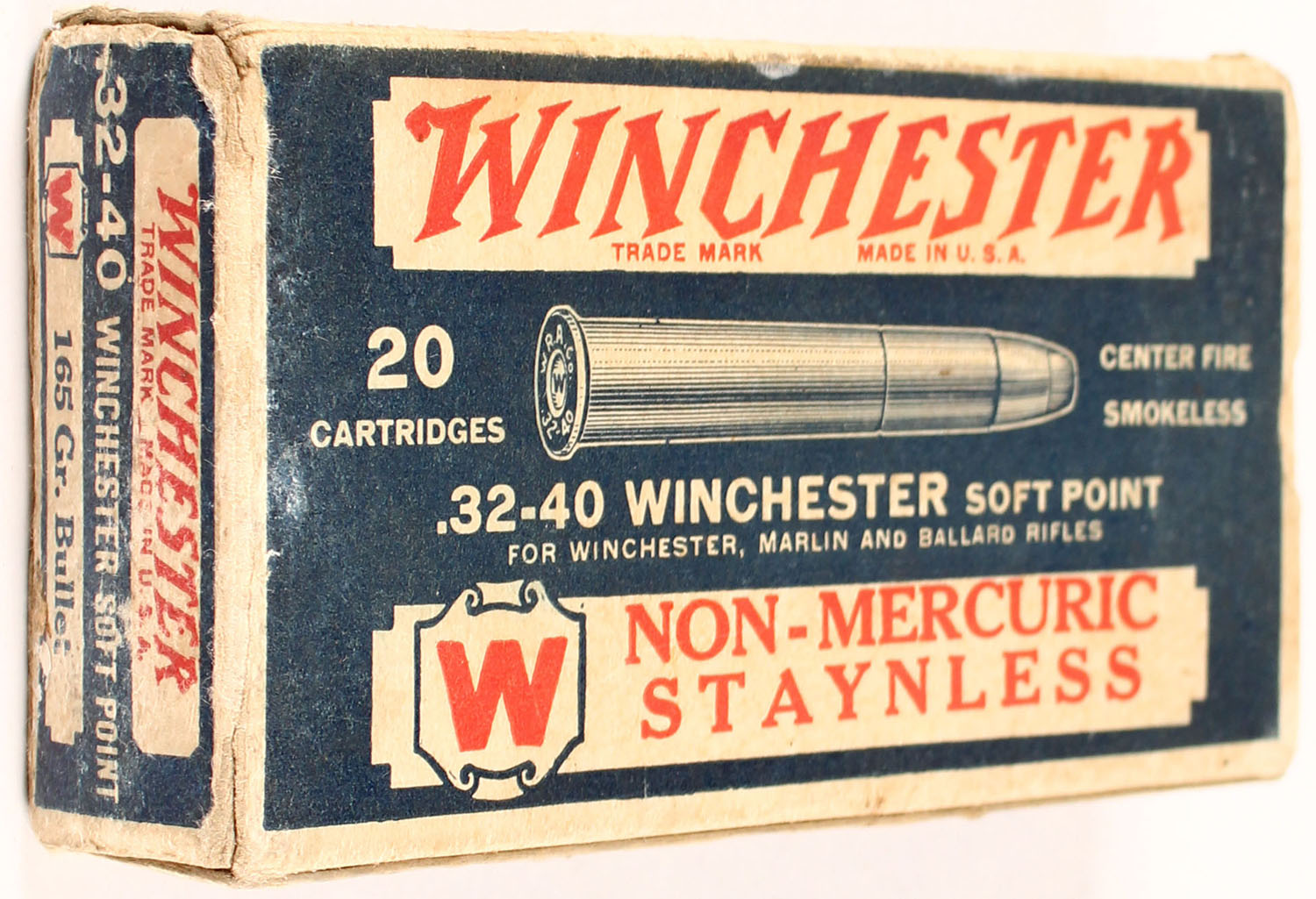 Winchester, Non-Mercuric Staynless, .32-40 Winchester, 165 Gr. Soft Point Bullet, Full, 1pc. Blue white & red box, box is solid with very good to excellent color, some age soiling, minor edge & corner wear, end flaps are solid, ammo is excellent. Grade: Excellent - Value: 100 to 300