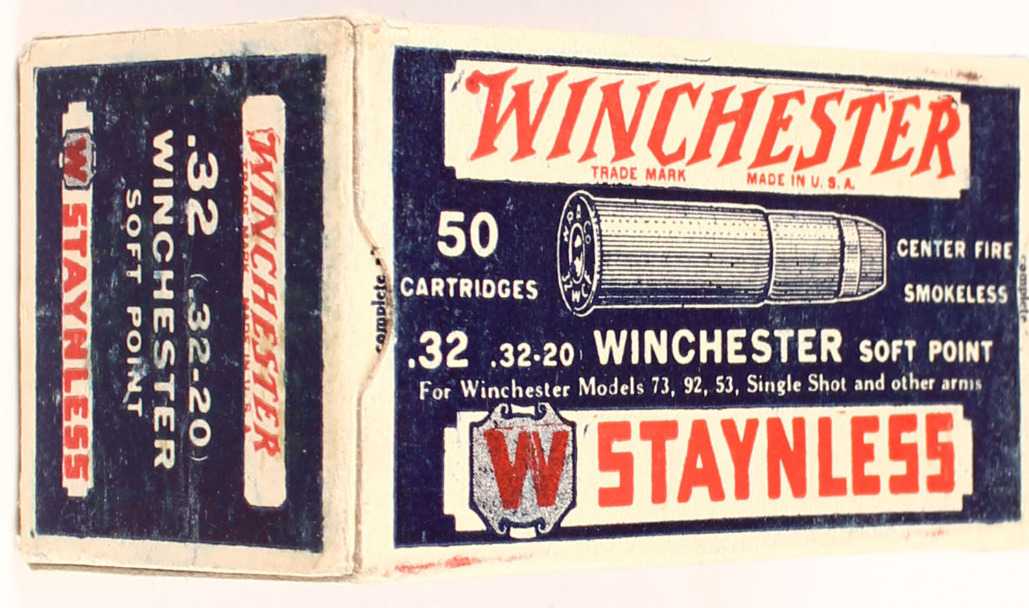Winchester, Staynless, .32 Winchester (.32-20), Soft Point, Full, 1pc. Blue white & red box, box is solid with excellent color, only minor shelf wear, minor corner wear, edges are mostly crisp, end flaps are solid, ammo is excellent. Grade: Excellent + - Value: 100 to 200