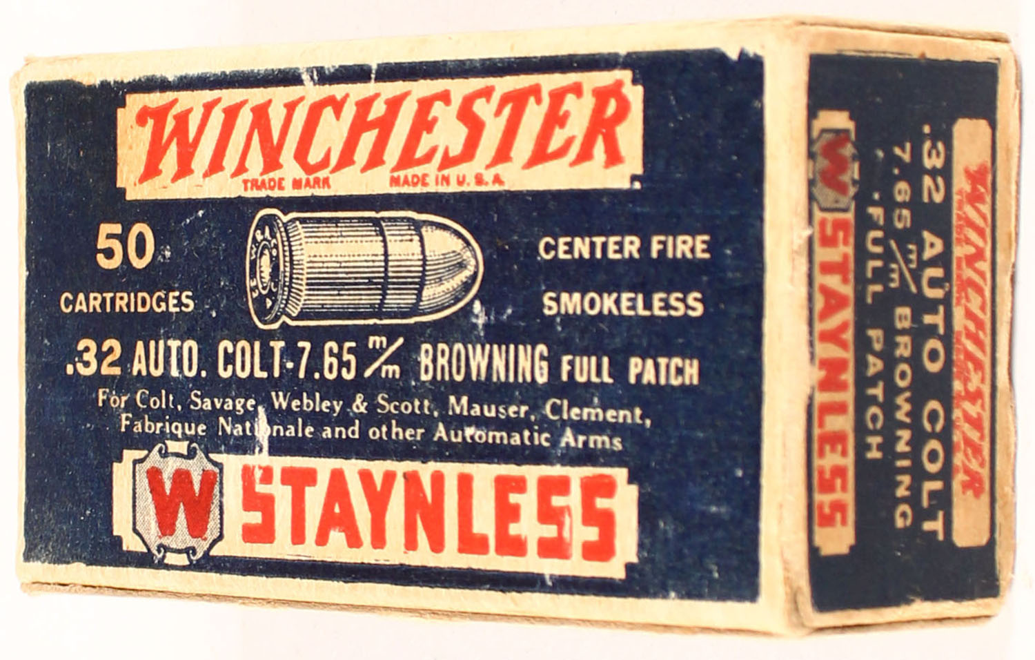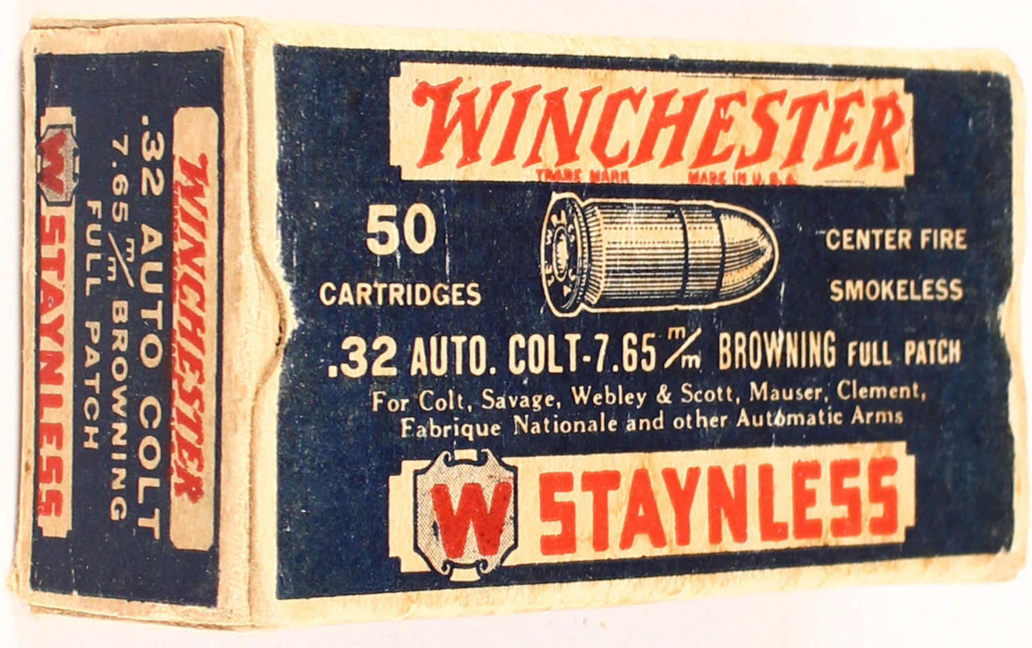 Winchester, Staynless, .32 Auto. Colt - 7.65mm Browning, Full Patch, Full of Mixed H/S, 1pc. Blue white & red box, box is solid with very good color, some age soiling & corner wear, very minor shelf wear, edges are mostly crisp, end flaps are solid, ammo is excellent to minty. Grade: Excellent - Value: 20 to 80