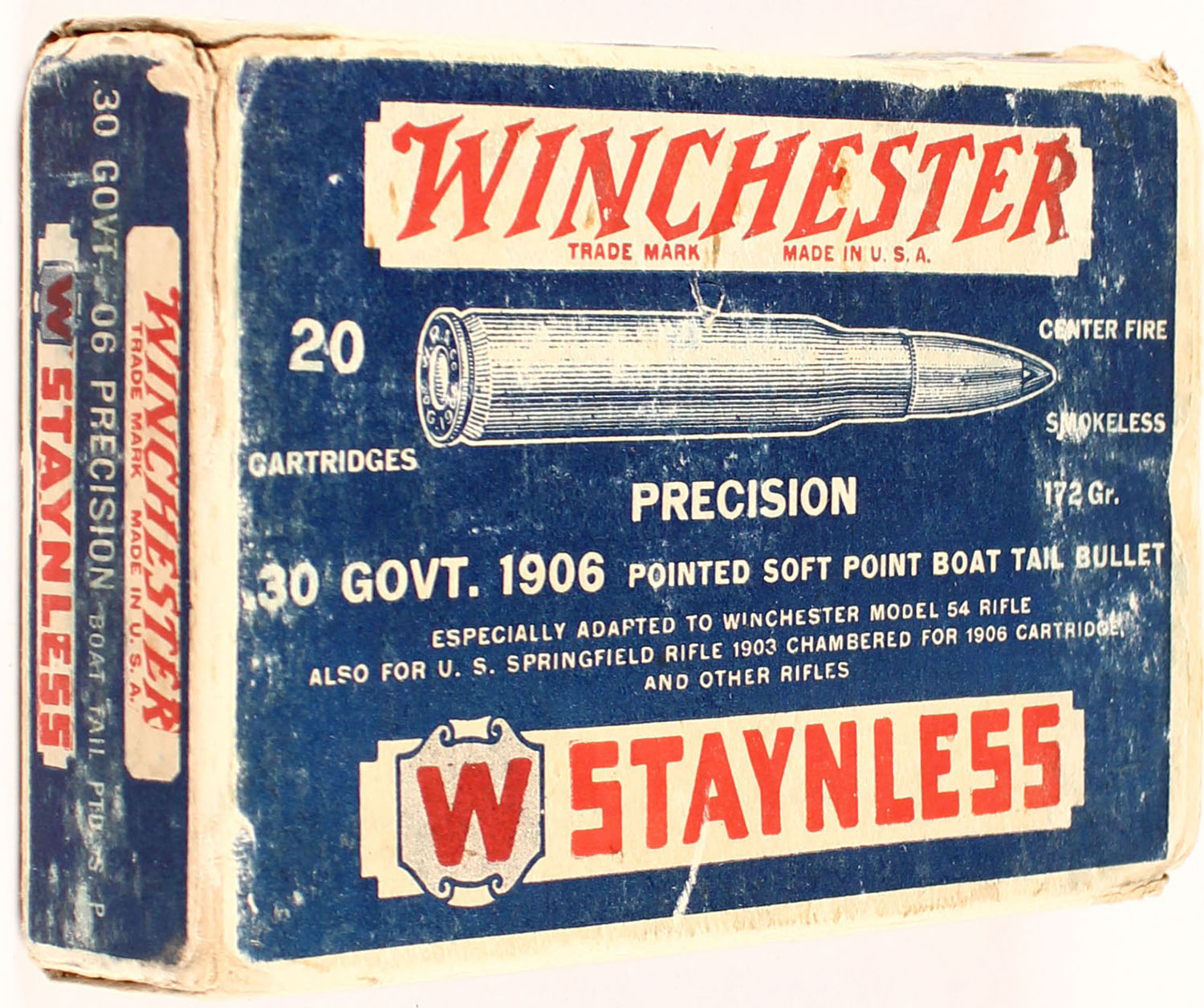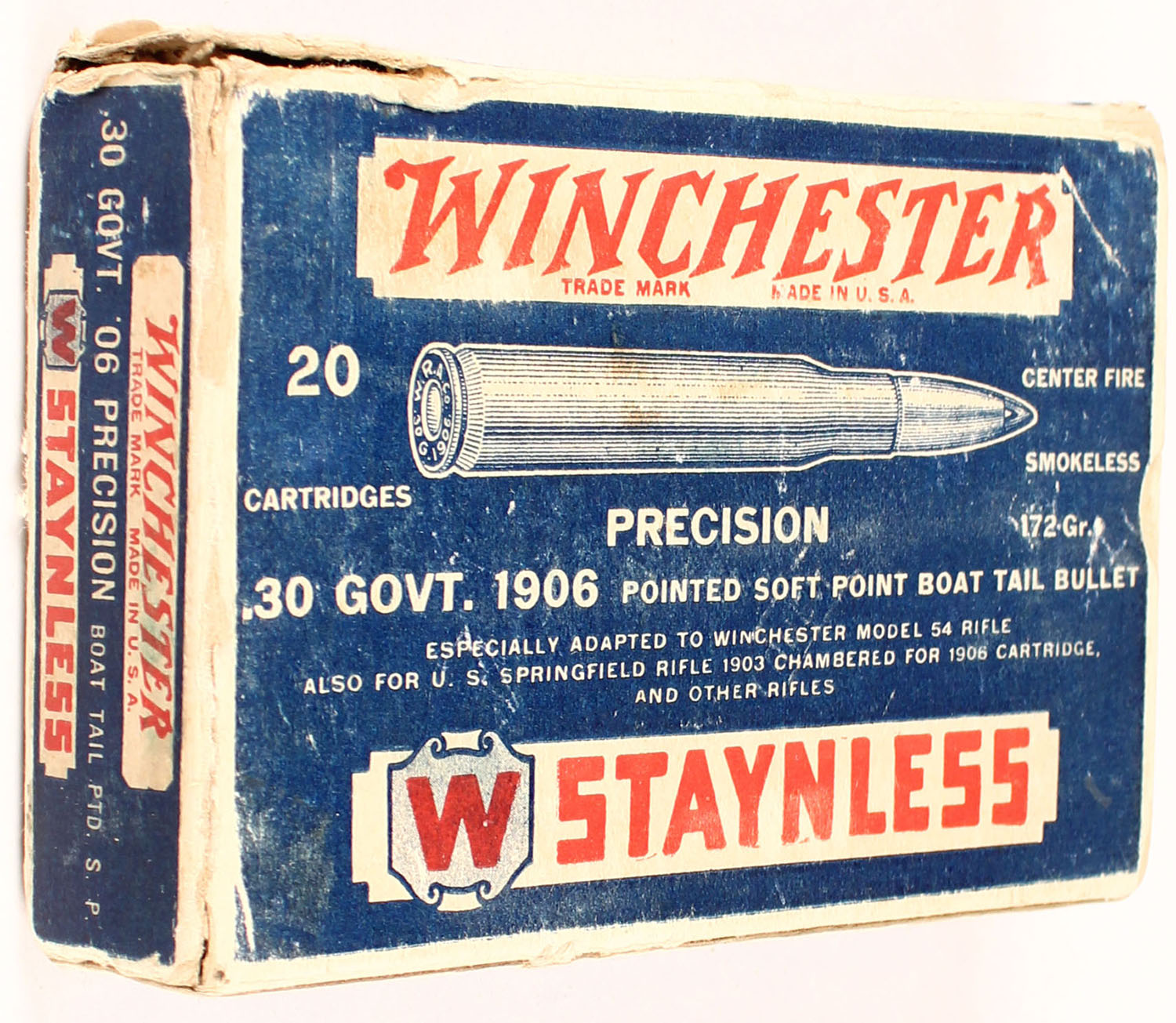 Winchester, Staynless, 30 Govt. 1906 (.30-06). Precision 172 Gr. Boat Tail Pointed Soft Point, Full. 1pc. Blue white & red box, box is solid with very good color, minor age soiling, some shelf wear, edge & corner wear, partial seam split to both end flaps, ammo is very good. Grade: Very Good ++ - Value: 20 to 80