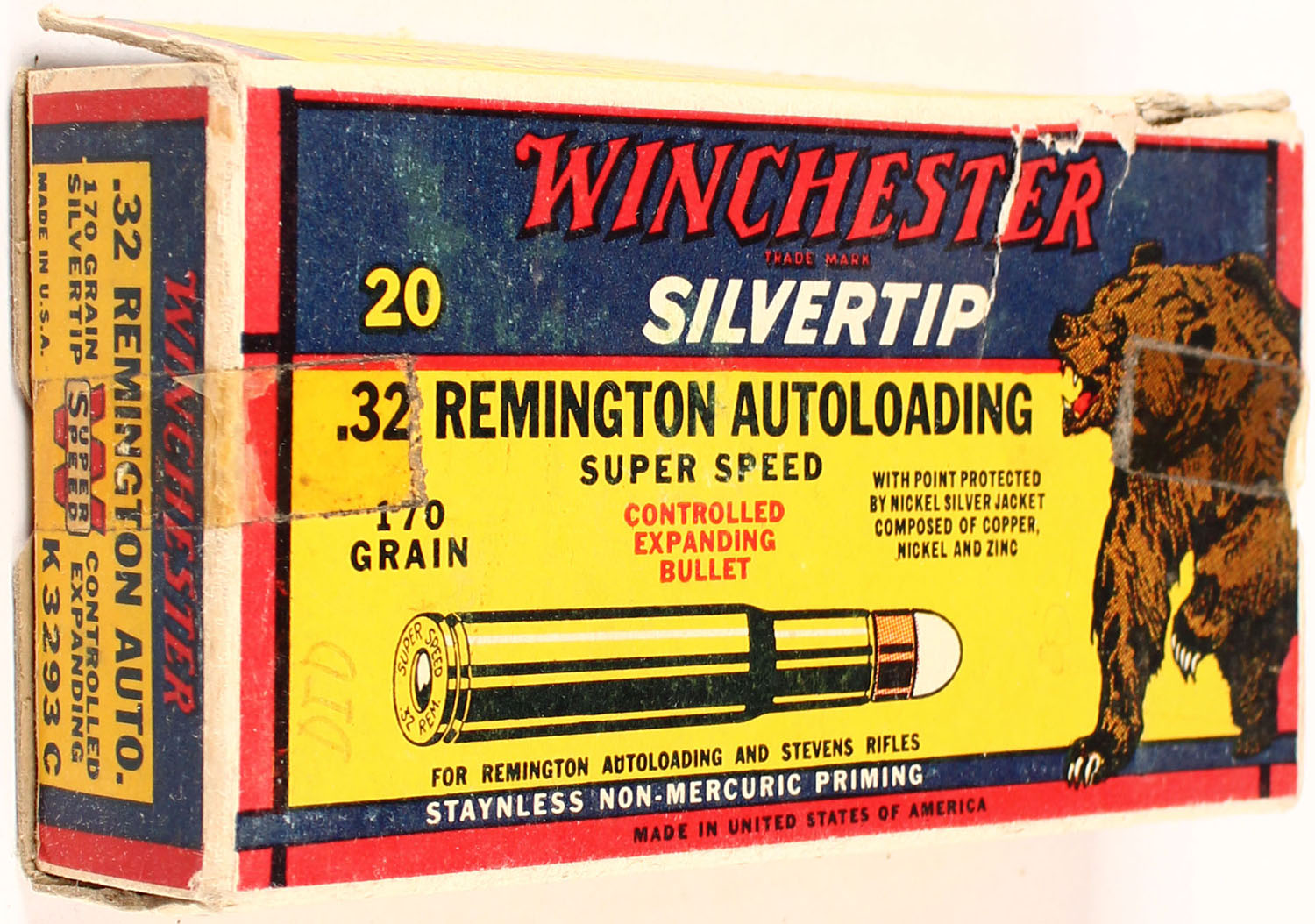Winchester, Silvertip, .32 Remington Autoloading, 170 Grain Controlled Expanding Bullet, Full, 1pc. Yellow blue & red bear box, box is solid with excellent color, very minor age soiling, tape on both ends, partial seam split on top back edge, top has been written on, minor edge & corner wear, end flaps are solid, ammo is excellent. Grade: Very Good - Value: 20 to 80