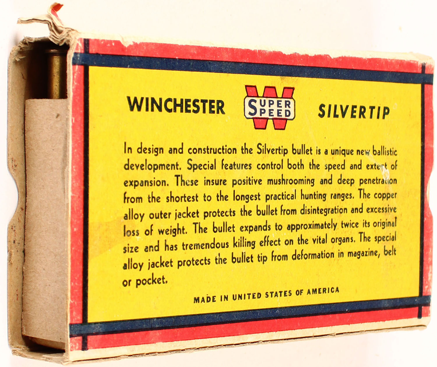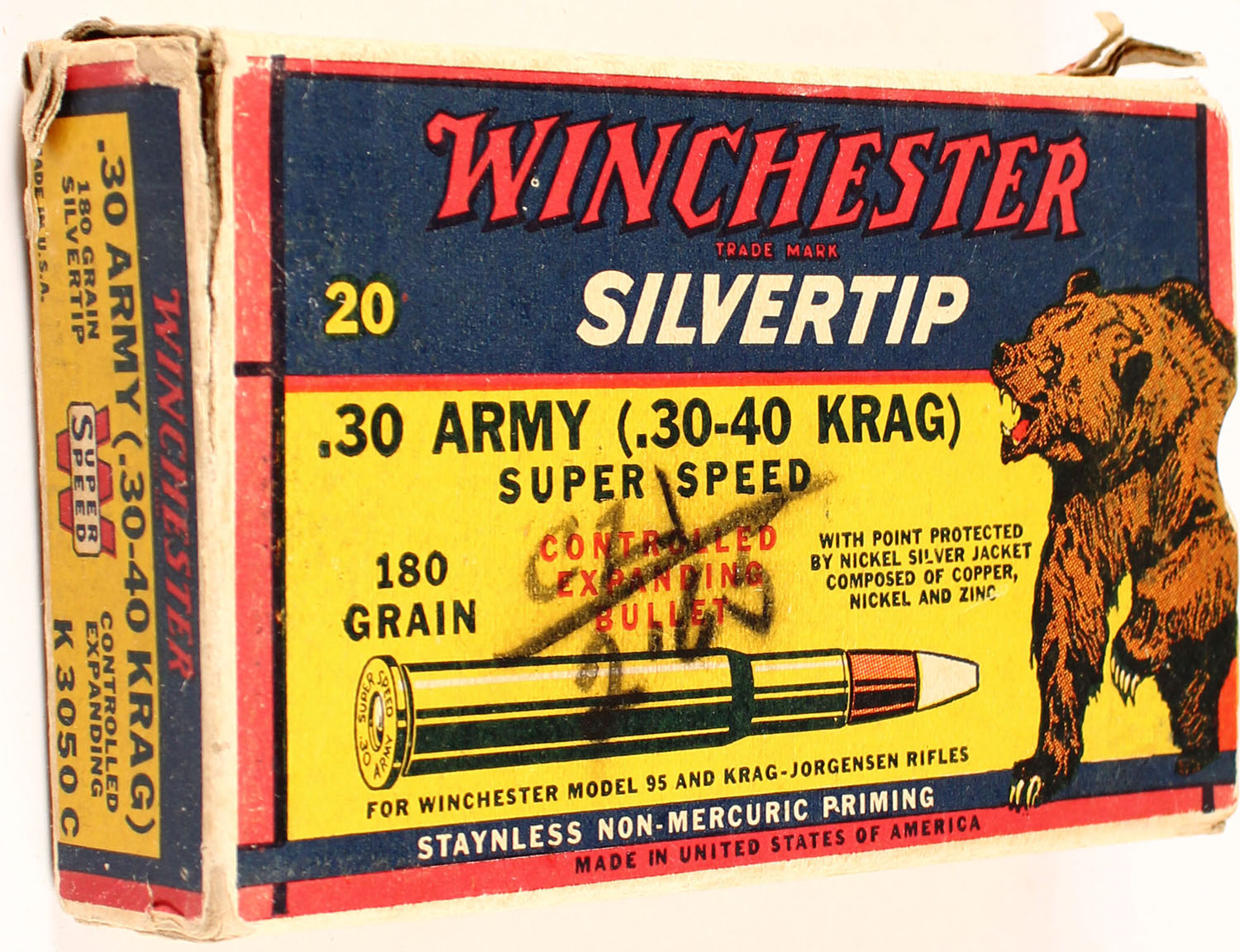 Winchester, Silvertip, .30 Army (.30-40 Krag), 180 Grain Controlled Expanding Bullet, Full of Mixed Ammo, 2pc. Yellow blue & red bear box, box is missing right end flap, very good to excellent color, minor age soiling, partial seam split to left end flap, top and back side have been written on, some corner wear, very minor edge wear, ammo is excellent. Grade: Very Good - Value: 20 to 60