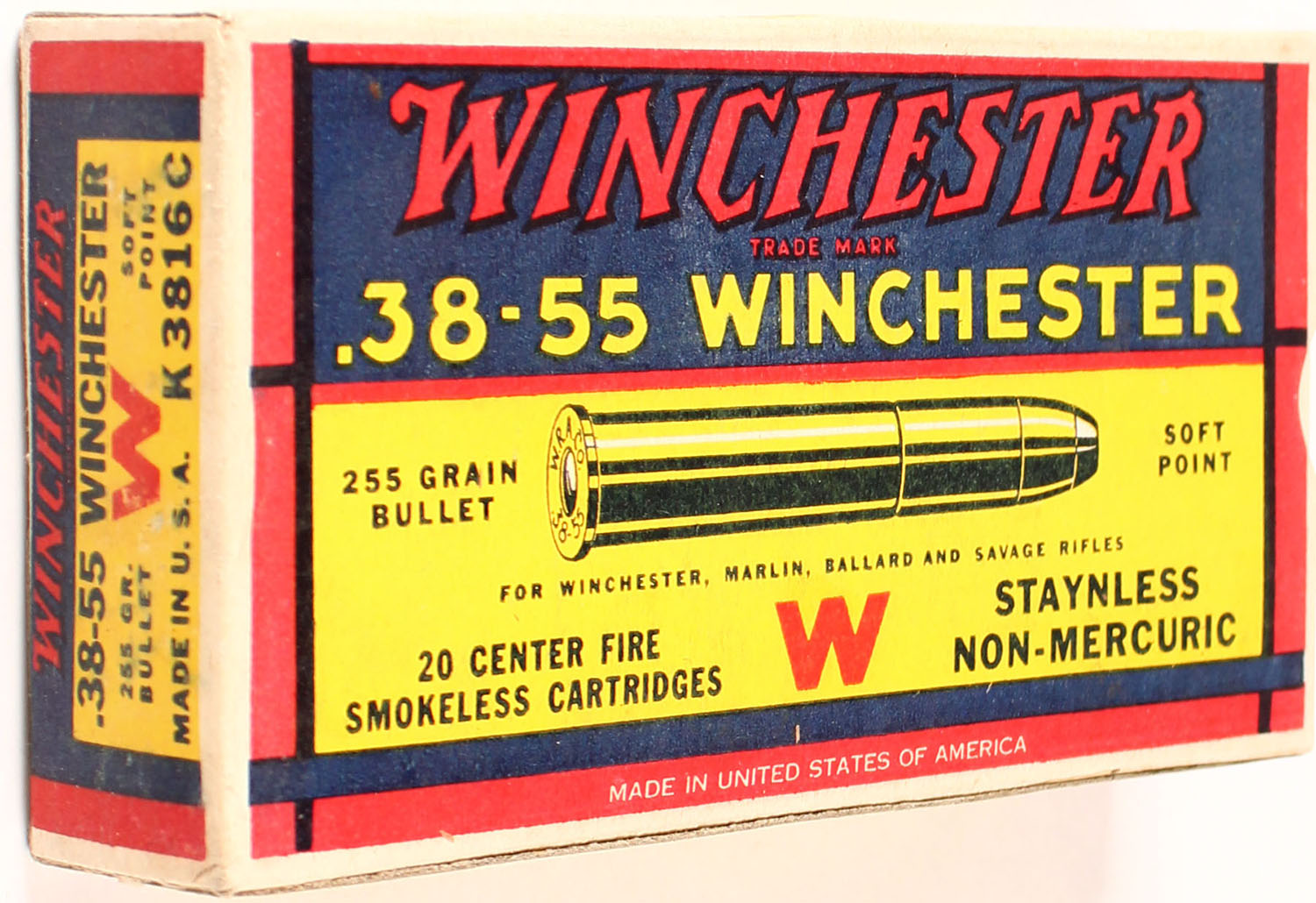 Winchester, Super Speed, .38-55 Winchester, 255 Grain Soft Point Bullet, Full, 1pc. Yellow blue & red box with FOR SAAMI over-stamp, box is solid with excellent color, very minor shelf wear, corners are sharp, edges are crisp, end flaps are solid, ammo is good. Grade: Excellent ++ - Value: 40 to 120