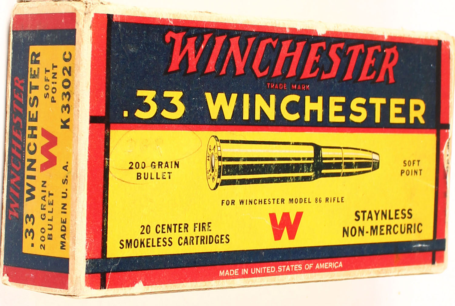 Winchester, .33 Winchester, 200 Grain Soft Point Bullet, Full of Mixed Ammo, 1pc. Yellow blue & red box, box is solid with excellent color, minor age soiling & corner wear, very minor edge wear, bottom has been written on, end flaps are solid, ammo is excellent. Grade: Excellent + - Value: 30 to 90