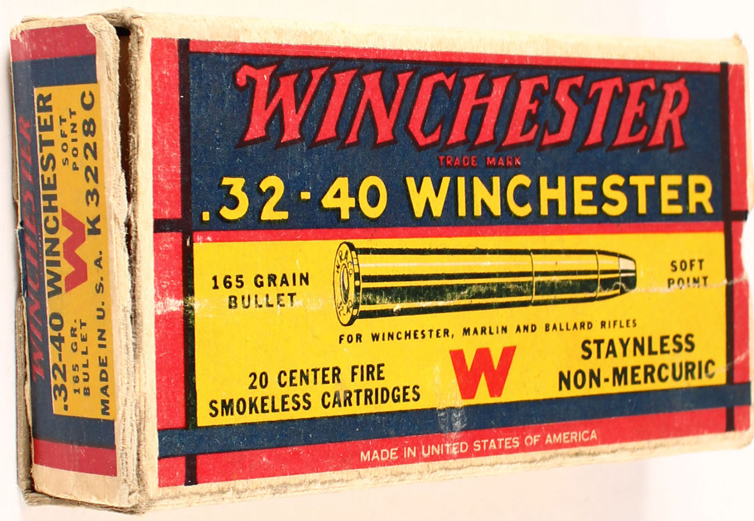 Winchester, .32-40 Winchester, 165 Grain Soft Point Bullet, Partial 18rds., 1pc. Yellow blue & red box, both end flaps are torn , box has excellent color, with minor age soiling, some shelf wear, minor edge & corner wear, ammo is excellent. Grade: Very Good + - Value: 30 to 90