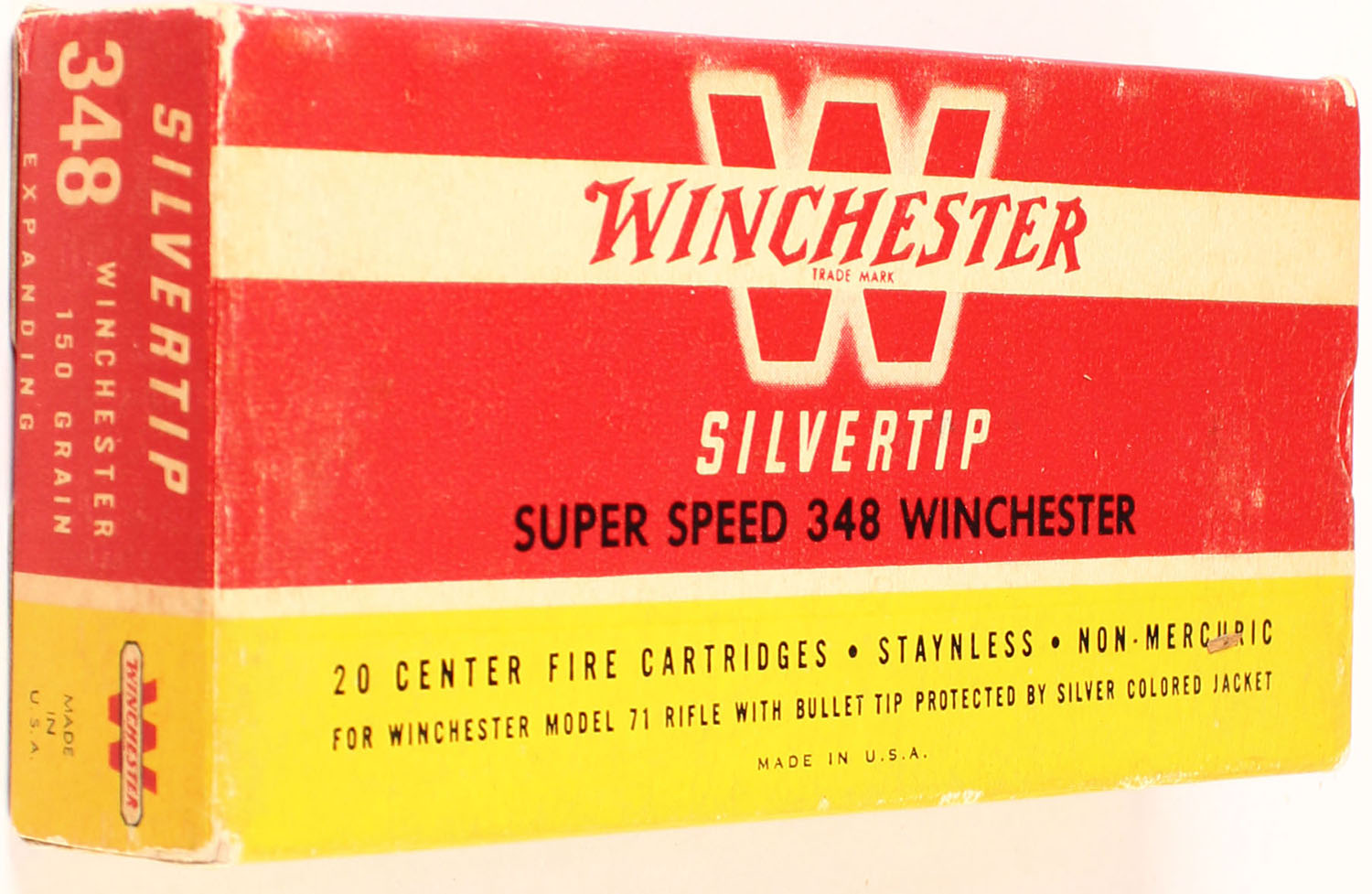 Winchester, Silvertip, .348 Winchester, 150 Grain Controlled Expanding Bullet, Full, 1pc. Red yellow & white box, box is solid with excellent color, some age soiling, very minor shelf wear, minor corner wear, edges are mostly crisp, end flaps are solid, ammo is excellent. Grade: Excellent + - Value: 30 to 90