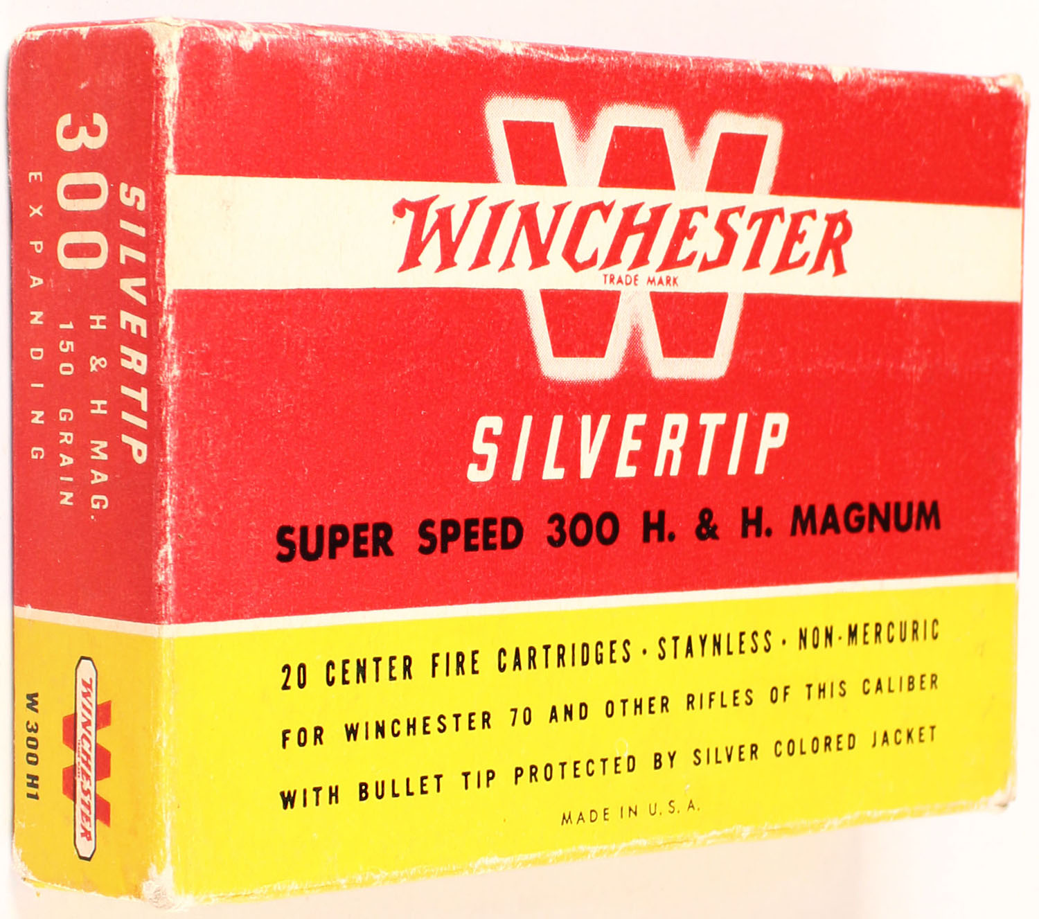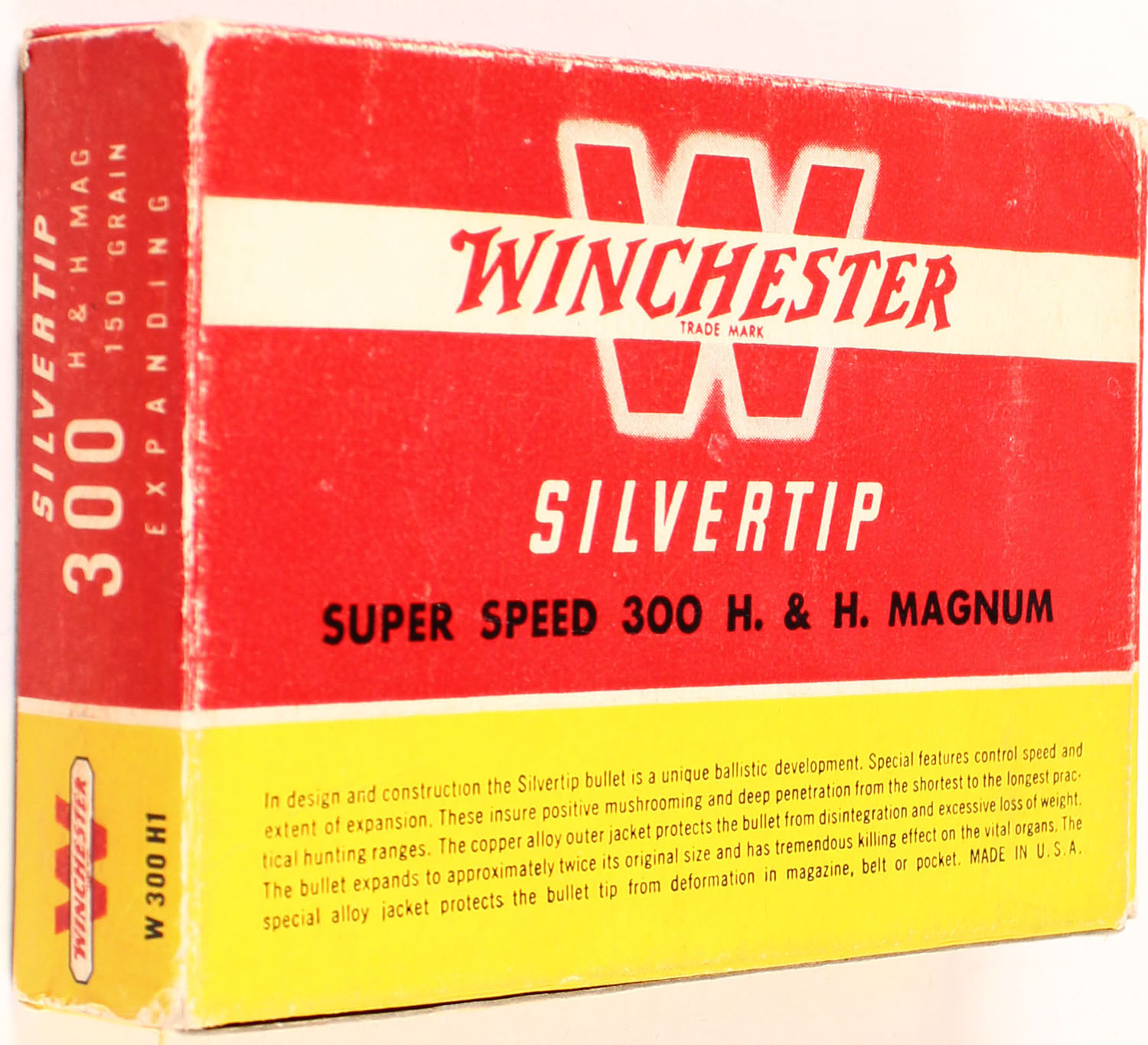 Winchester, Silvertip, .300 H&H Magnum, 150 Grain Controlled Expanding Bullet, Full, 1pc. Red yellow & white box, box is solid with excellent color, very minor shelf wear, some corner wear, minor edge wear, end flaps are solid, ammo is excellent. Grade: Excellent + - Value: 30 to 90