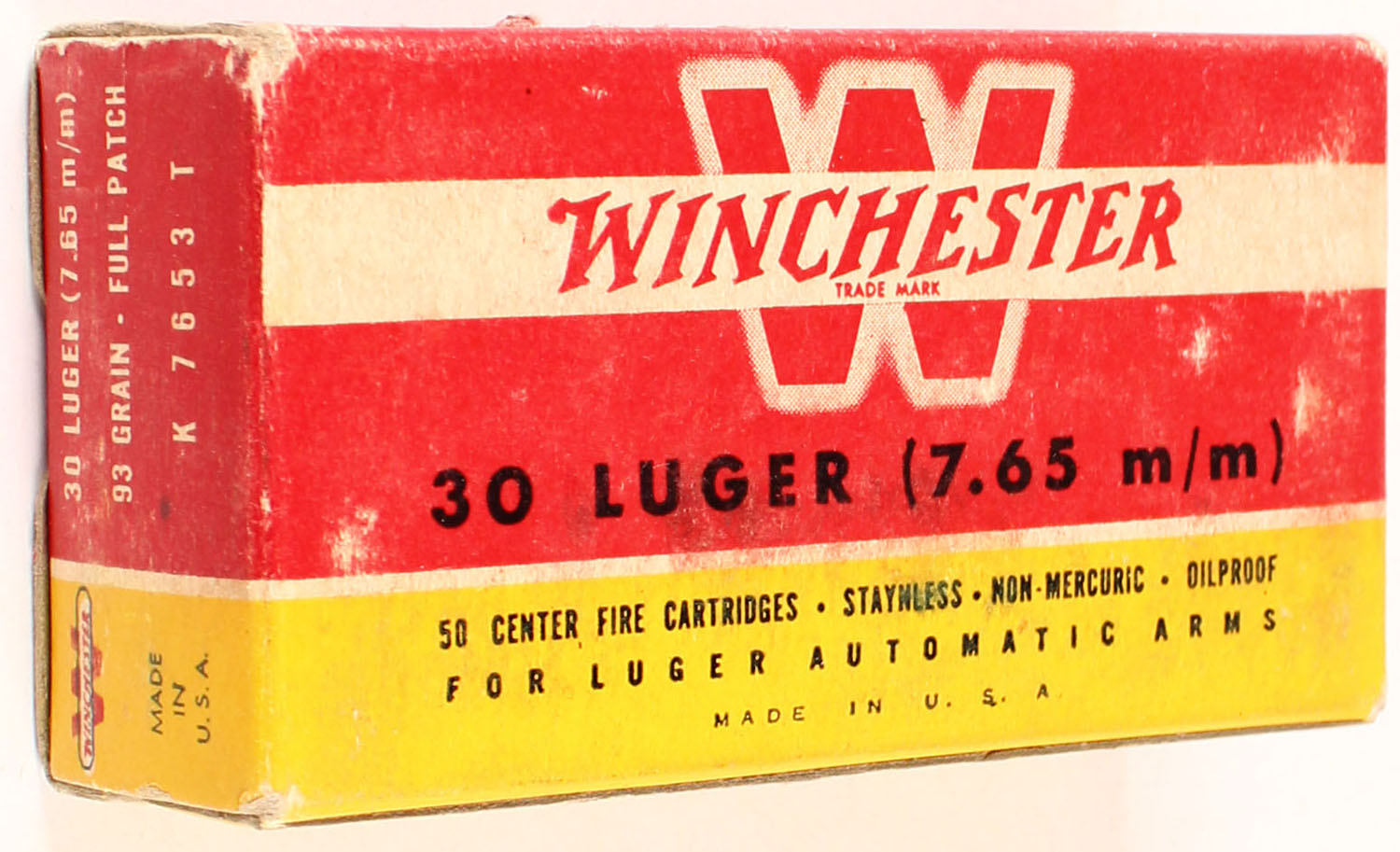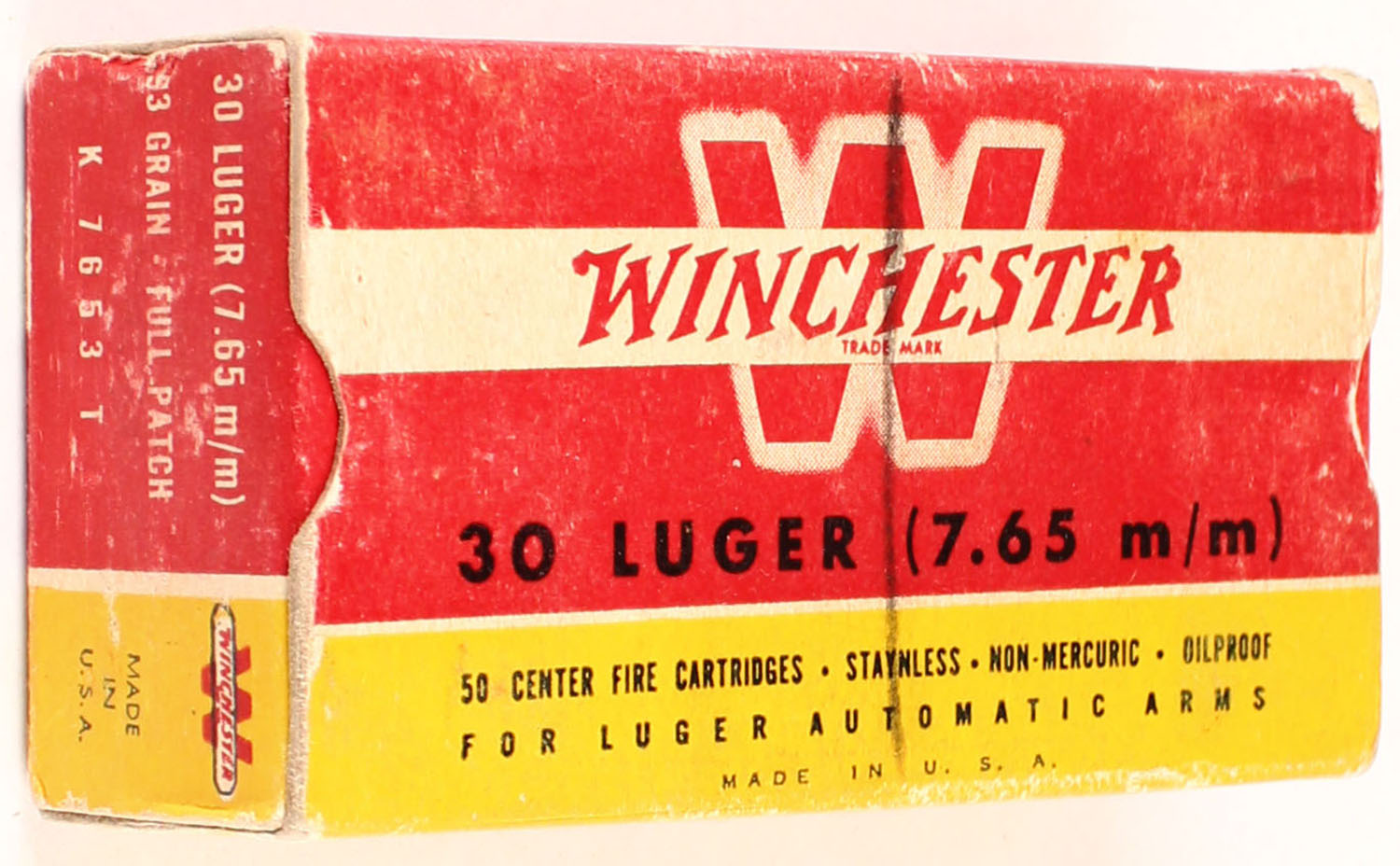Winchester, .30 Luger (7.65mm), 93 Grain Full Patch, Full, 1pc. Red yellow & white box, box is solid with very good to excellent color, minor age soiling & shelf wear, top has been written on, very minor edge & corner wear, end flaps are solid, ammo is excellent. Grade: Excellent + - Value: 10 to 40